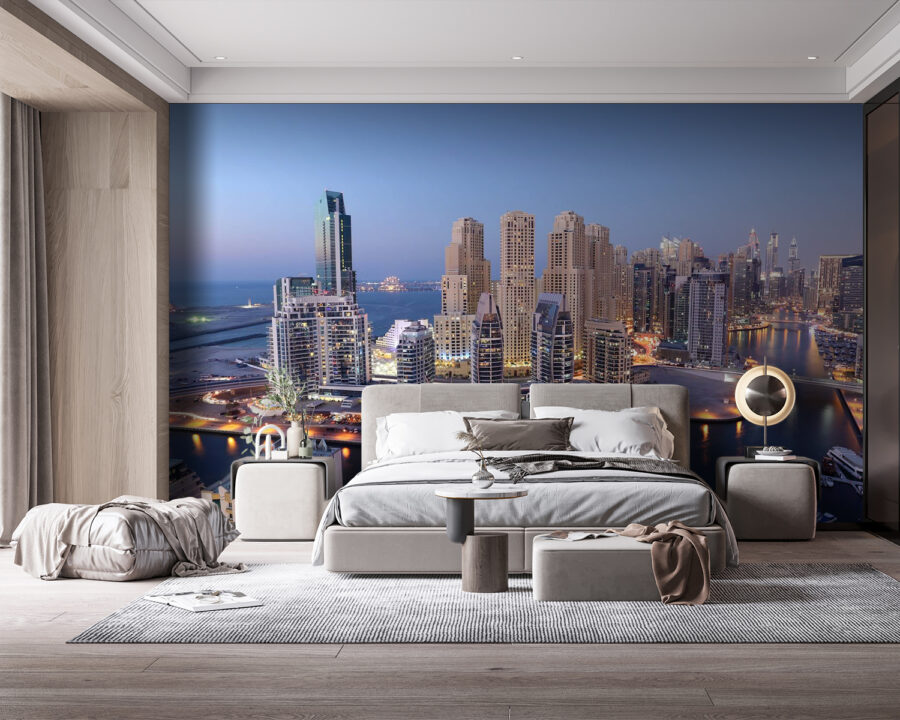 Consiga un trozo de magia urbana con este cautivador mural de pared titulado “Vista de ángulo alto de un edificio”. Imagínese entrar en su espacio y ser transportado instantáneamente a un bullicioso paisaje urbano donde los elegantes rascacielos se encuentran con un sereno paseo marítimo. Perfecto para los entusiastas de la arquitectura o para aquellos que simplemente vibran con esa estética elegante y moderna. Las luces parpadean suavemente mientras la ciudad bulle de vida; sí, es así de evocador.