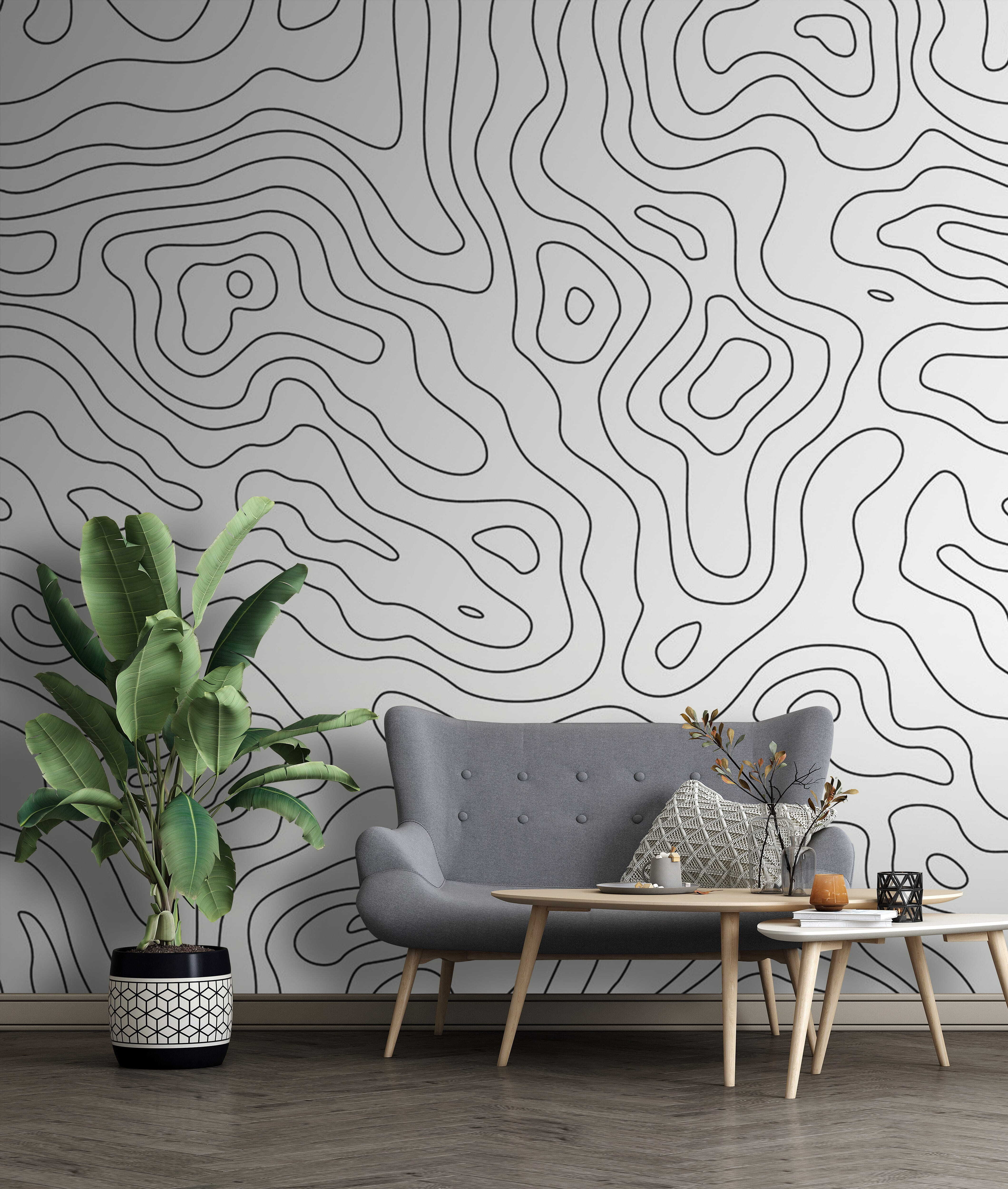 Oh, ¡tienes que ver este mural! Se llama “Línea negra sobre fondo blanco” y es realmente genial. Imagina líneas abstractas que parecen un mapa topográfico, pero más artísticas, casi lúdicas. Tiene un aire minimalista perfecto para hacer que cualquier habitación resulte más interesante sin agobiar el espacio.