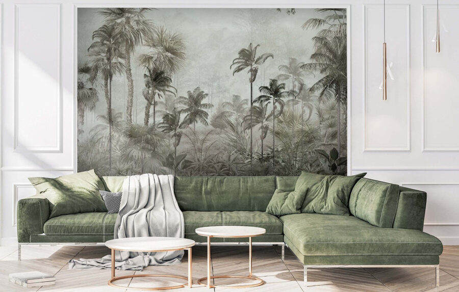 Transforma cualquier habitación en un remanso de paz con este impresionante mural que muestra un grupo de palmeras asomándose a través de un bosque brumoso. Es como adentrarse en una selva de ensueño sin salir de casa. Los tonos suaves y el ambiente brumoso crean una atmósfera tranquila y relajante, perfecta para tardes de ocio o veladas acogedoras. Imagina acurrucarte con un libro o saborear tu bebida favorita mientras te sientes envuelto por la naturaleza. Por no hablar de que es un tema de conversación. ¡Seguro que tus invitados te preguntarán de dónde viene ese paraíso sereno! Déjate llevar por el lado salvaje de la decoración y deja que este mural te transporte.