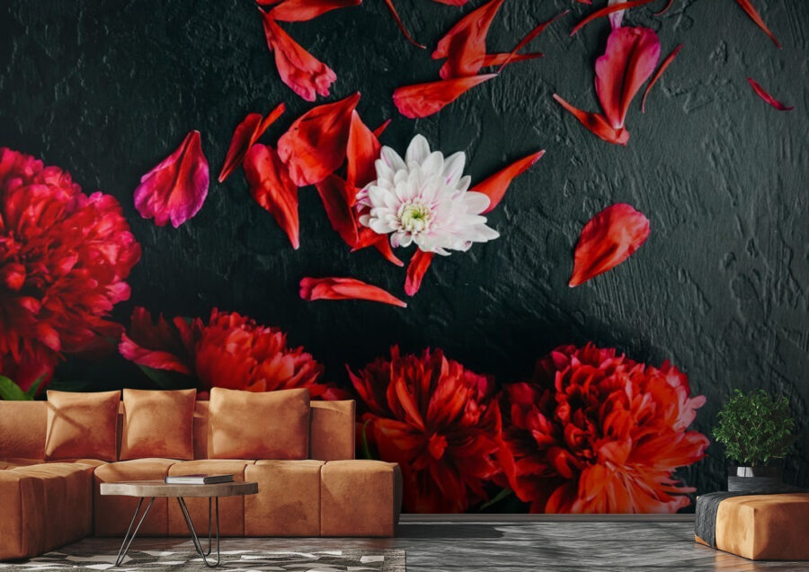 Transforma tu espacio con este impresionante mural que muestra un vibrante grupo de peonías rojas sobre un elegante fondo negro. Es como llevar un jardín al interior, ¡pero sin los molestos insectos! Imagina despertarte cada día rodeado de estas exuberantes flores, cuyos vivos colores aportan alegría y calidez a cualquier estancia. El contraste de los pétalos ardientes contra una superficie oscura es simplemente impresionante; es un poco como tomar un café en una acogedora cafetería, donde el ambiente te envuelve como un abrazo. Perfecto para una sala de estar o quizás una oficina moderna; ¿quién no querría trabajar rodeado de tanta belleza? Con este mural, no solo estás decorando, sino que estás creando una experiencia. ¡Cada mirada te hará sentir un poco más inspirado!
