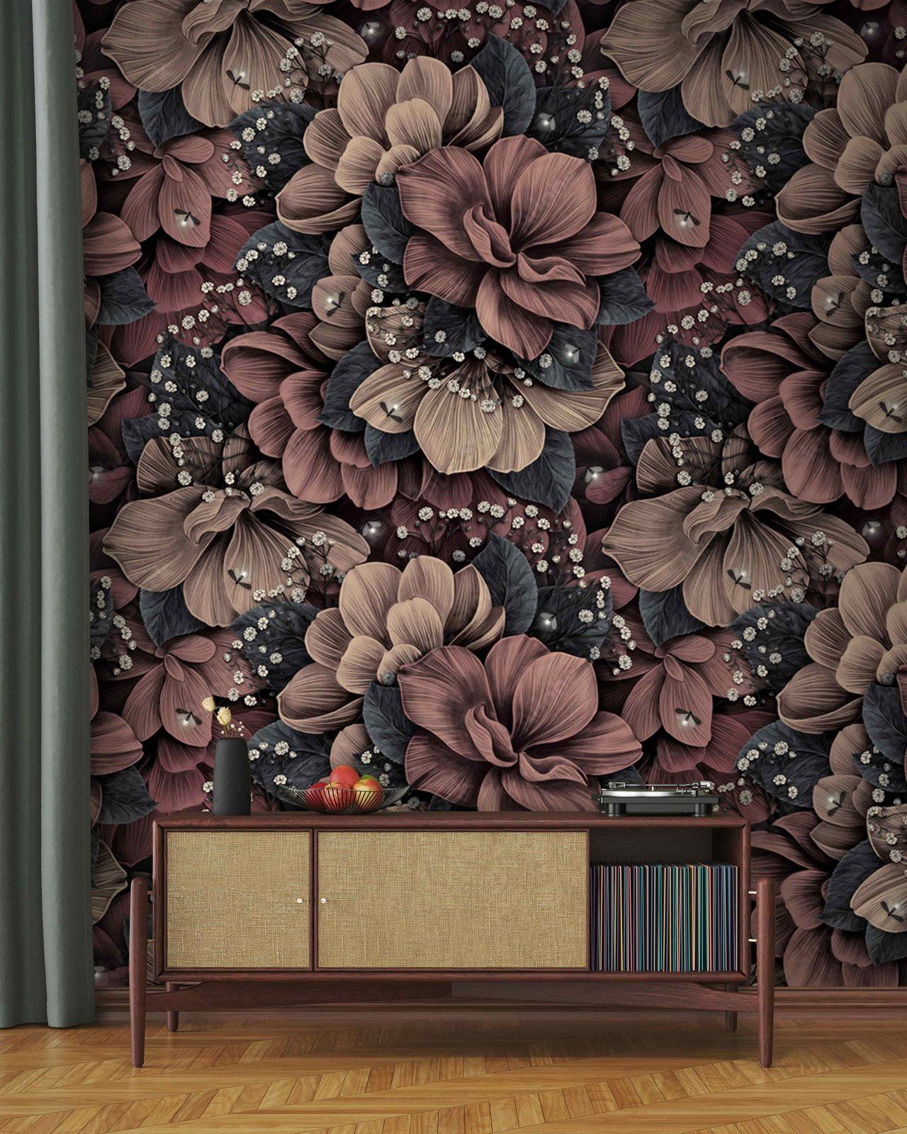 Imagínese esto en su salón: un motivo floral elegantemente detallado que le hace querer mirarlo todo el día. Este mural tiene un diseño cálido e intrincado que casi parece vivo. Los ricos colores se mezclan maravillosamente, creando una sensación de profundidad que te atrae. Es como tener un exuberante jardín en la pared, sin necesidad de regarlo.