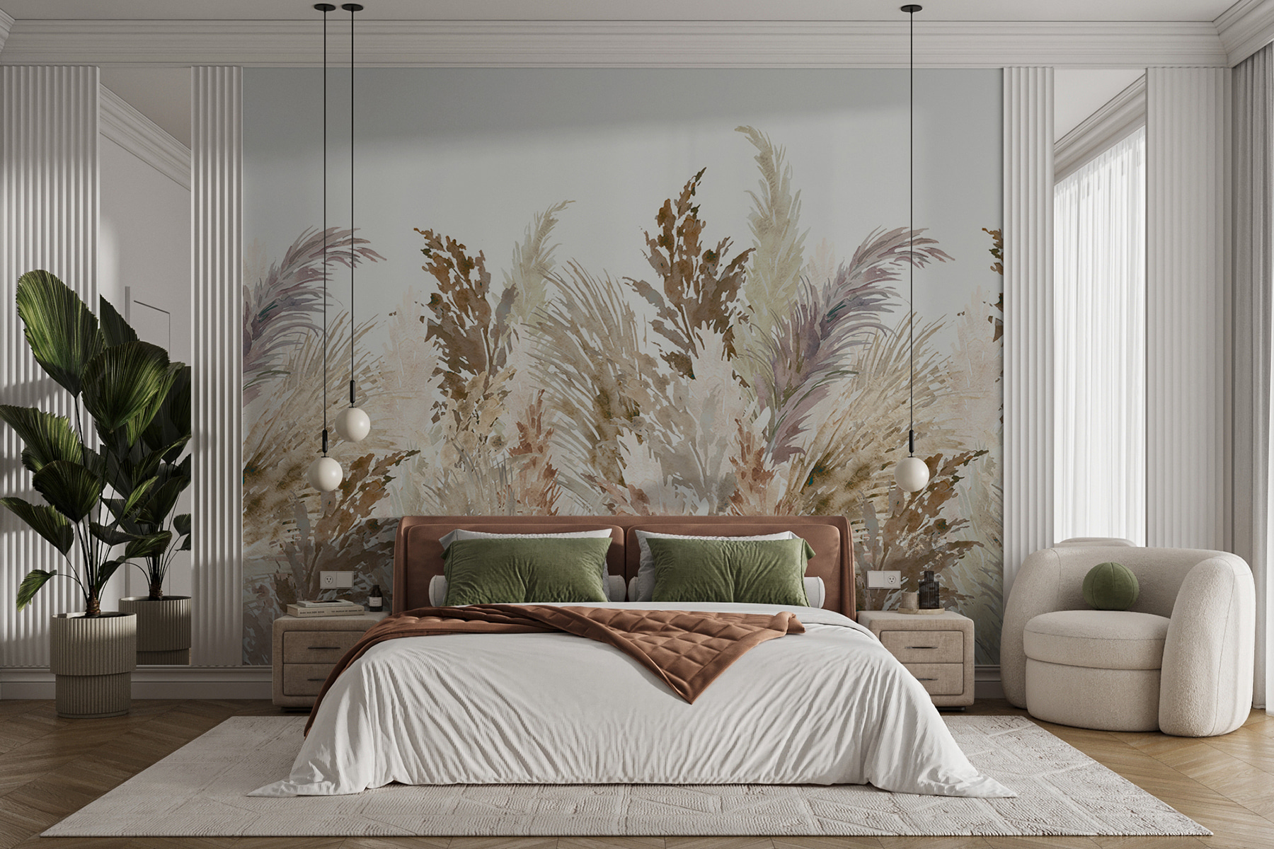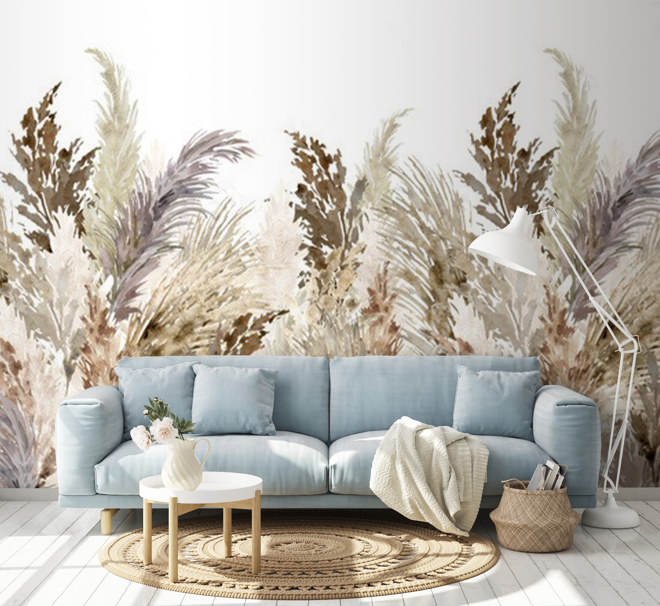 Transforme su espacio en un refugio acogedor con este impresionante mural de acuarela que presenta una delicada disposición de hierba de la pampa. Imagínatelo: la luz fresca de la mañana filtrándose por la ventana, los tonos terrosos del mural envolviendo suavemente la habitación. Es como llevar un trozo de naturaleza al interior sin tener que regar las plantas. Sus amigos se maravillarán al ver cómo el mural eleva sin esfuerzo el ambiente, perfecto para los domingos perezosos o para una cena con estilo. Esta obra de arte susurra tranquilidad a la vez que añade un toque chic que simplemente sienta bien. No es sólo decoración; es un recordatorio diario para respirar y disfrutar de las pequeñas cosas.
