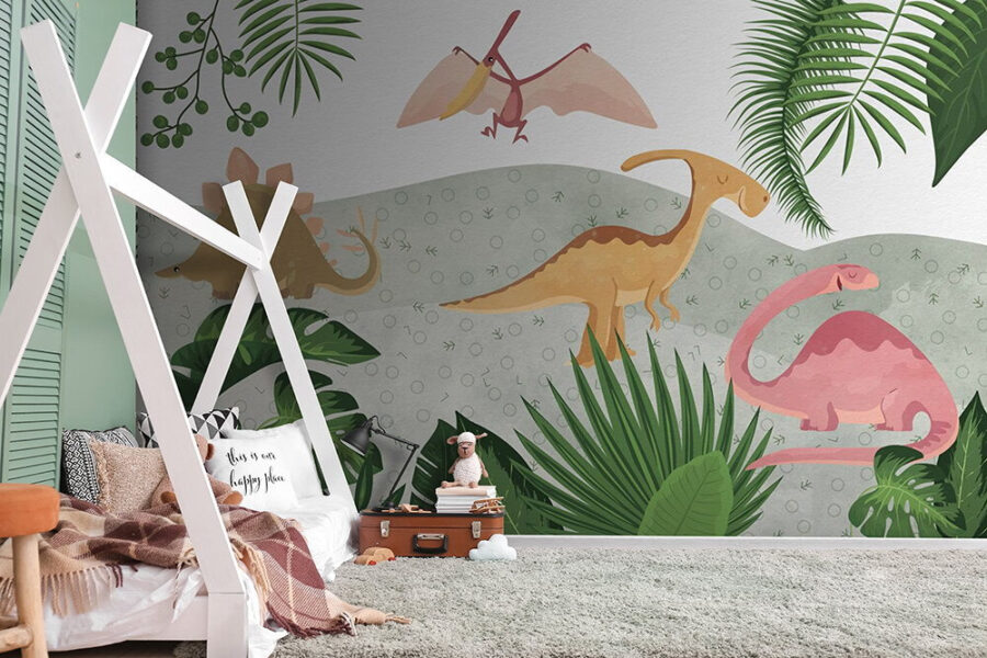Transforma cualquier espacio infantil en un paraíso de dinosaurios con este encantador «Mural de pared con grupo de dinosaurios y hojas». Imagina a esos pequeños exploradores contemplando a los juguetones herbívoros y al descarado pterosaurio volador: ¡su imaginación se disparará! Es más que un simple mural, es una historia que espera a que una mente curiosa la desvele. Cada dinosaurio parece casi vivo, listo para entrar en acción. Los relajantes tonos verdes y pasteles añaden una atmósfera tranquila, como un pequeño rincón de un paraíso prehistórico. Este mural no es solo decoración, es una invitación a la aventura y un toque de alegría en cualquier habitación. Perfecto para inspirar la creatividad y, seamos sinceros, ¿quién no querría despertarse rodeado de simpáticos dinosaurios?