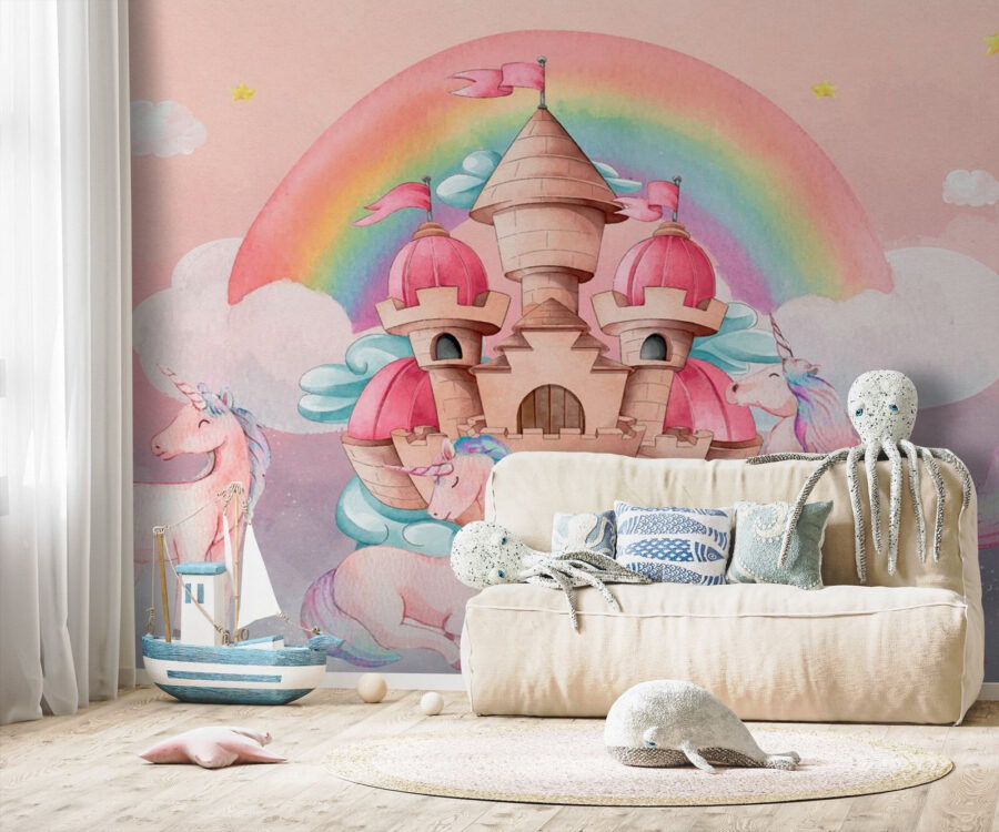 Los encantadores detalles, como la cesta de comida que lleva despreocupadamente un unicornio, añaden un toque juguetón que despierta la imaginación. Uno podría imaginarse una fiesta de té de ensueño junto al castillo, bajo un cielo lleno de estrellas centelleantes y nubes esponjosas. Los suaves tonos pastel calientan el corazón y hacen del mural un centro de mesa acogedor. No es sólo decoración de pared; es una puerta a los sueños y las aventuras.