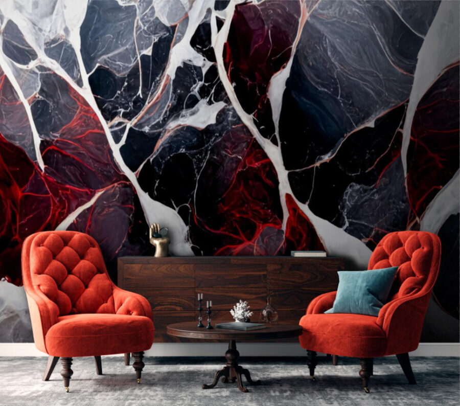 ¿Alguna vez has pensado que tu pared podría ser algo más que, ya sabes, una pared? Te presento esta obra maestra en rojo y negro. Es como tener una obra de arte abstracto en el salón de tu casa, pero sin tener que ir de pijo. Este mural mezcla negros profundos, grises ahumados y rojos ardientes de una forma que simplemente grita “soy mucho más guay que una pared pintada”. Imagínatelo: llegas a casa después de un largo día y, en lugar del aburrido beige, te recibe este atrevido diseño que te llena de energía y te reconforta a la vez. Tiene ese toque dramático del mármol sin el toque frío, perfecto para rincones acogedores o para esa pared que necesita un poco más de… fuerza. Convierta su espacio en una galería, o simplemente en un lugar donde las conversaciones empiecen solas. Adelante, piérdase en sus profundidades.