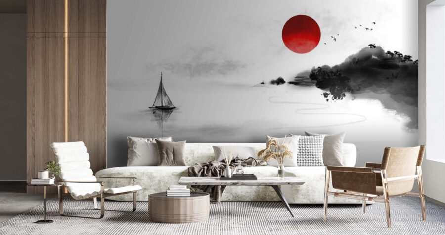 Imagínese entrar en una habitación y ser recibido por una escena tan pacífica: este mural de pared de ensueño representa un círculo rojo sobre un sereno fondo blanco. Es como su propia obra de arte Zen. El atrevido sol rojo destaca de forma llamativa, ofreciendo un toque de color revitalizante difícil de ignorar. Combínalo con el paisaje suave y brumoso y conseguirás el equilibrio perfecto entre calma y vitalidad.