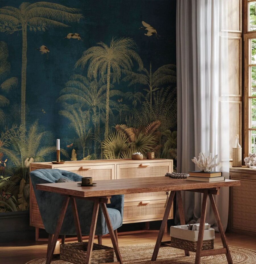 Transforma tu espacio con este impresionante mural, donde exuberantes palmeras y alegres pájaros cobran vida sobre un fondo de ensueño. Imagina entrar en una habitación que parece un refugio tropical. En serio, ¿quién necesita unas vacaciones con esta belleza en la pared? Los ricos tonos y los intrincados detalles crean un ambiente relajante, perfecto para un rincón de lectura acogedor o para dar vida a cualquier pared aburrida. Es como llevar un pedazo de naturaleza al interior, sin las picaduras de mosquitos. Tus amigos se preguntarán si has contratado a un decorador de lujo, pero no saben que es este mural el que hace la magia.