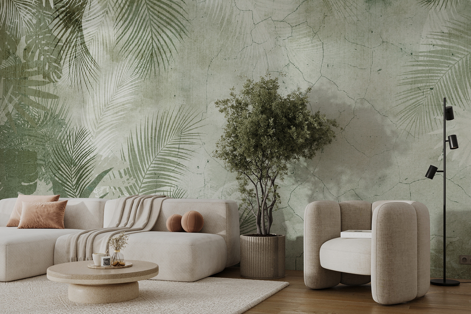 Transforme su espacio con este encantador mural de pared con hojas tropicales esparcidas sobre un fondo suave y texturizado. Imagínese entrar en una habitación que al instante se siente como una escapada a una isla paradisíaca, es como traer un pedacito de la naturaleza en el interior. Los sutiles tonos verdes y terrosos crean un ambiente acogedor que te hará sentir como si estuvieras descansando bajo las palmeras. Perfecto para un acogedor rincón de lectura o una animada sala de estar, este mural invita a momentos de relajación e inspira sueños de aventuras bañadas por el sol. Ilumine sus paredes y deje que la relajante esencia de los trópicos florezca en su hogar. ¿Quién diría que un mural podría hacer todo eso?