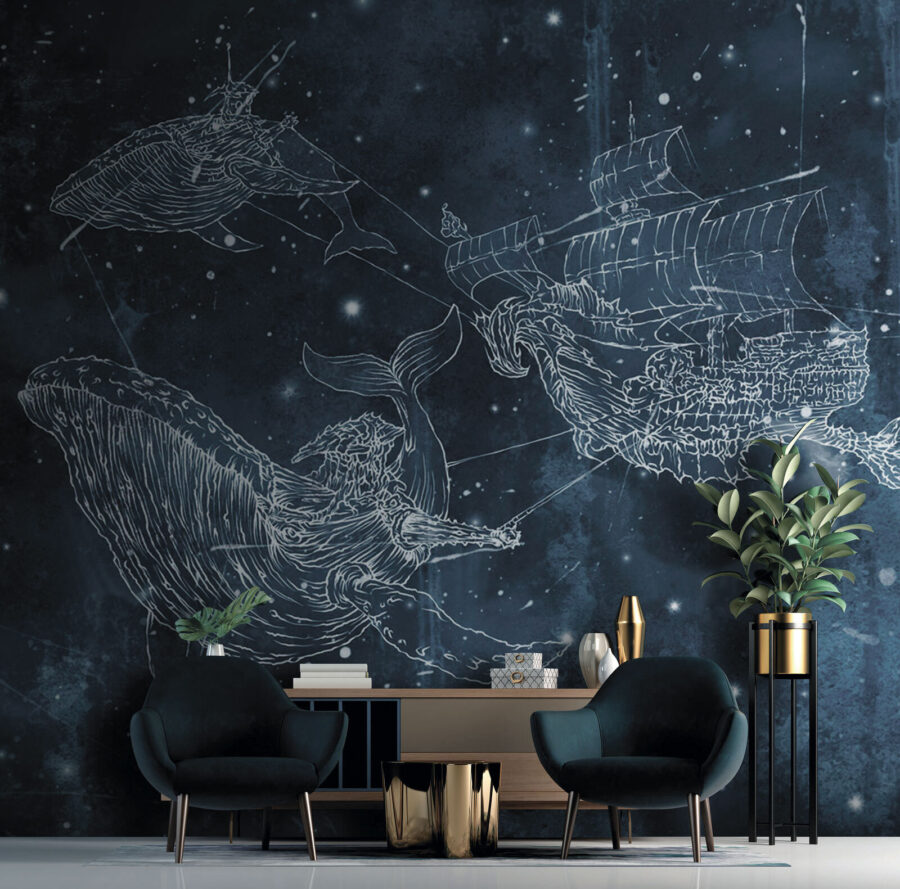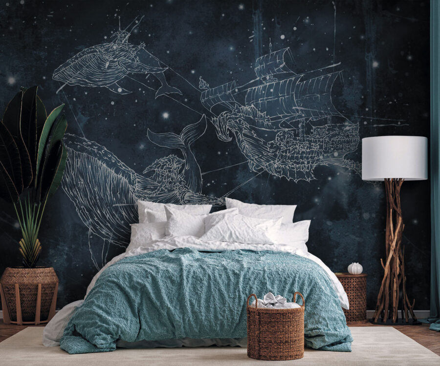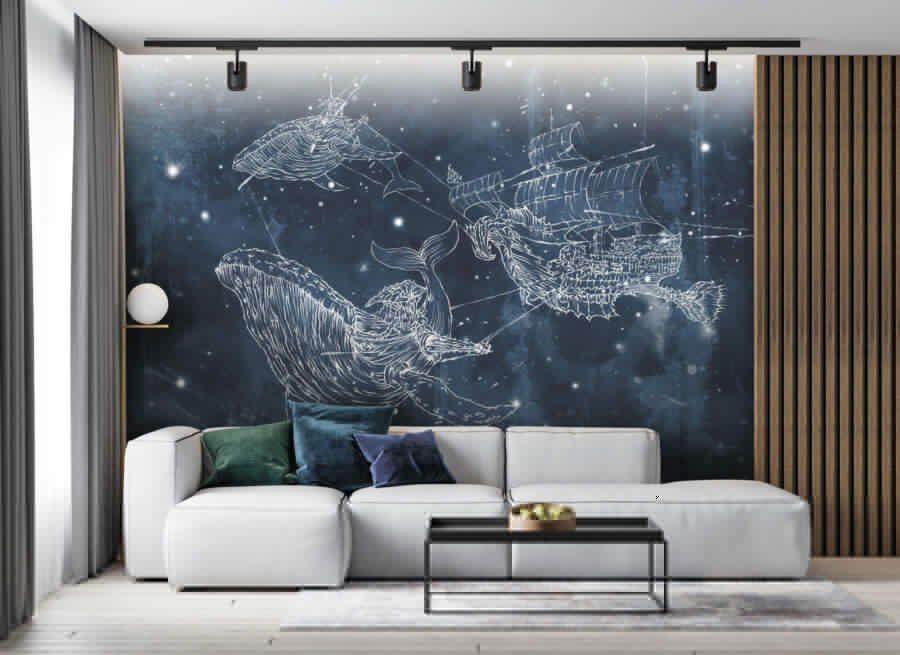 Imagínese que se despierta con la serenata de una ballena en la pared. Este mural “Dibujo de una ballena” es como sumergirse en un mar mágico: no es una decoración de pared corriente. Perfecto para los niños que sueñan con aventuras marinas y para los adultos jóvenes de corazón que quieren añadir un toque de maravilla oceánica a su espacio. Una mezcla de estrellas, ballenas y un misterioso barco navega entre azules crepúsculos, creando un caprichoso paisaje nocturno. Es como un cuento para dormir que cobra vida. Deja que esta encantadora escena te lleve al país de los sueños o haz que cualquier habitación navegue en una ola de creatividad y asombro. ¡Navega!