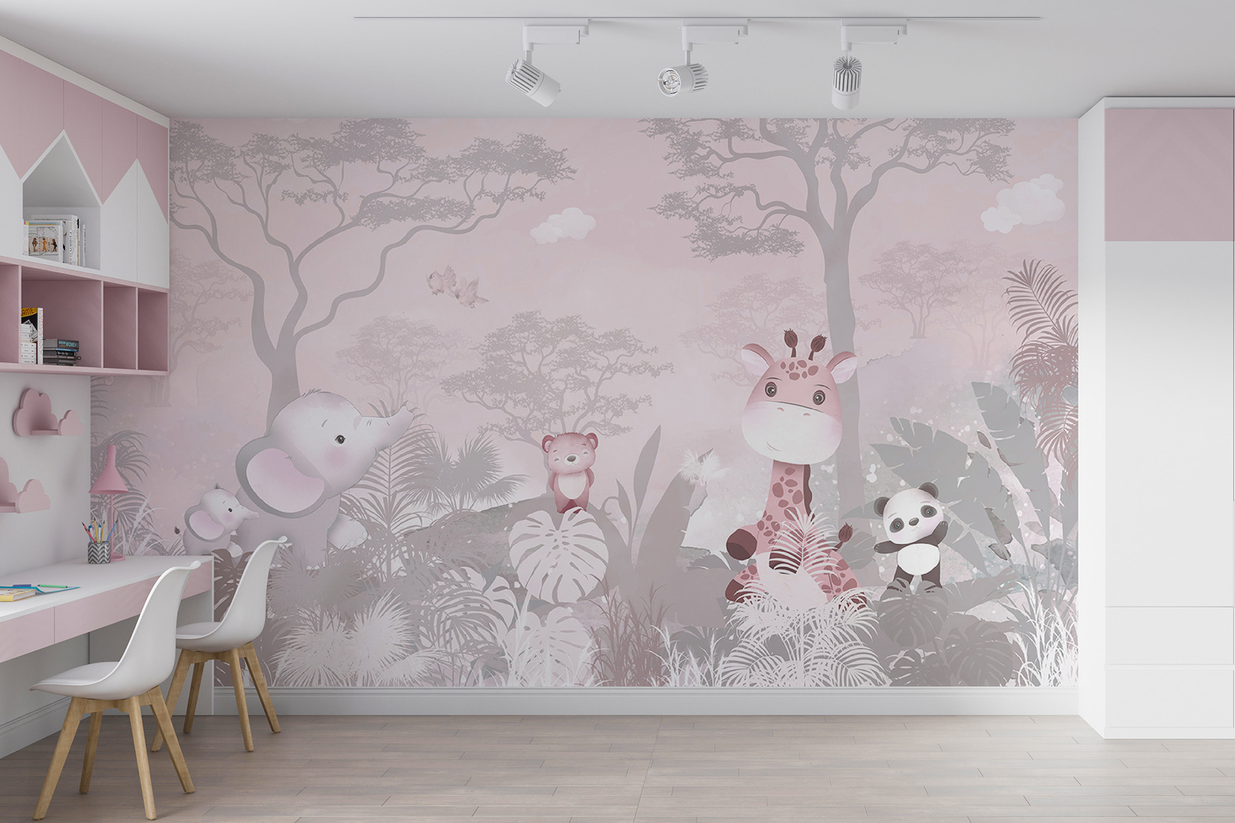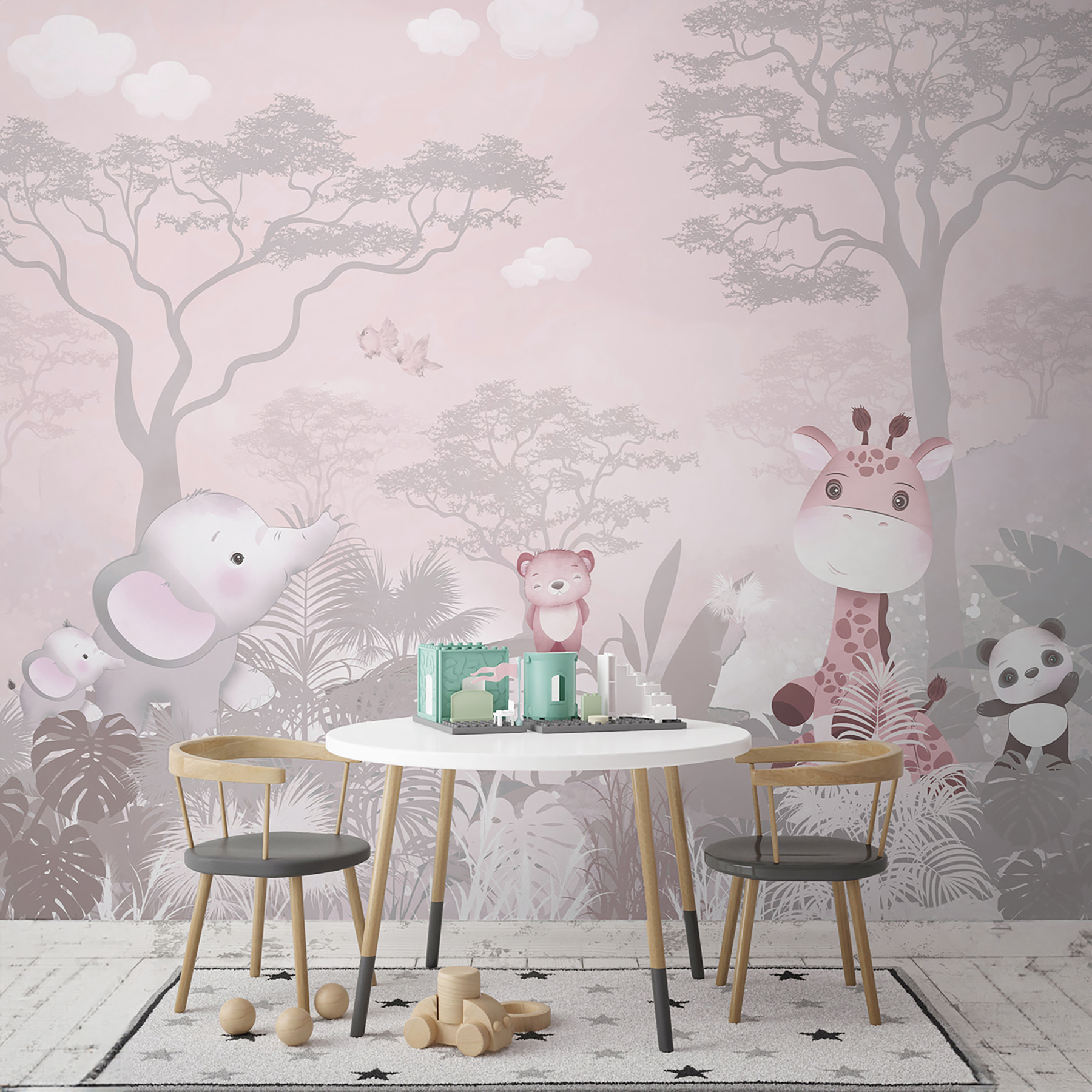 Imagínatelo: tu pequeño se despierta cada mañana con un alegre oso rosa, una jirafa de ensueño y un panda pequeñito, ¡qué manera de empezar el día! Tanto si está transformando una habitación infantil, una sala de juegos o incluso añadiendo encanto a la habitación de un adolescente, este mural le arrancará infinitas sonrisas. Es como si las paredes susurraran tiernas aventuras, incitando a la imaginación a volar.