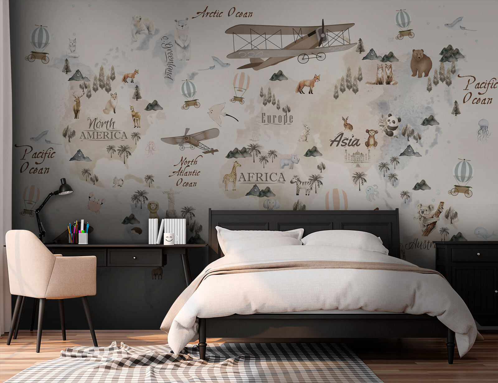 Imagine transformar la habitación de su hijo en una aventura de ensueño. Este mural “Vintage Map with Animals & Aircrafts” es pura magia y definitivamente no es sólo para niños. Tiene ese maravilloso encanto del viejo mundo mezclado con toques caprichosos: globos aerostáticos, animales encantadores y aviones de época. Tú también te perderás en él.