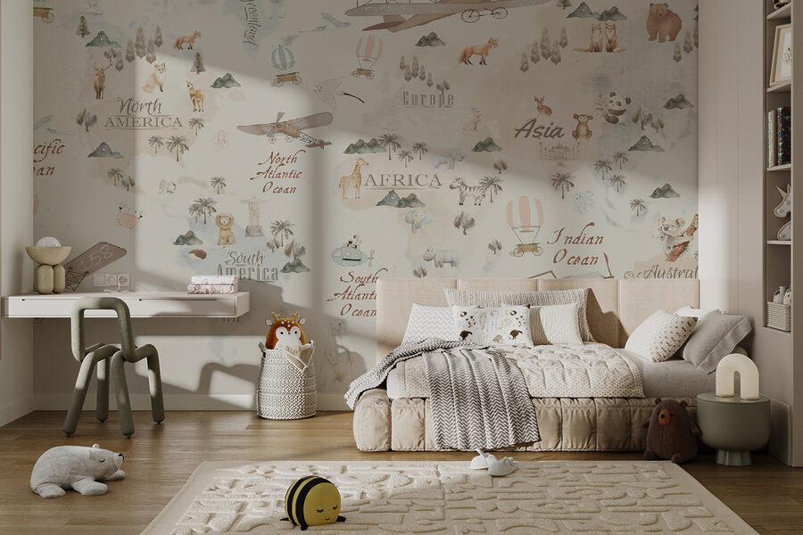 Imagine transformar la habitación de su hijo en una aventura de ensueño. Este mural “Vintage Map with Animals & Aircrafts” es pura magia y definitivamente no es sólo para niños. Tiene ese maravilloso encanto del viejo mundo mezclado con toques caprichosos: globos aerostáticos, animales encantadores y aviones de época. Tú también te perderás en él.