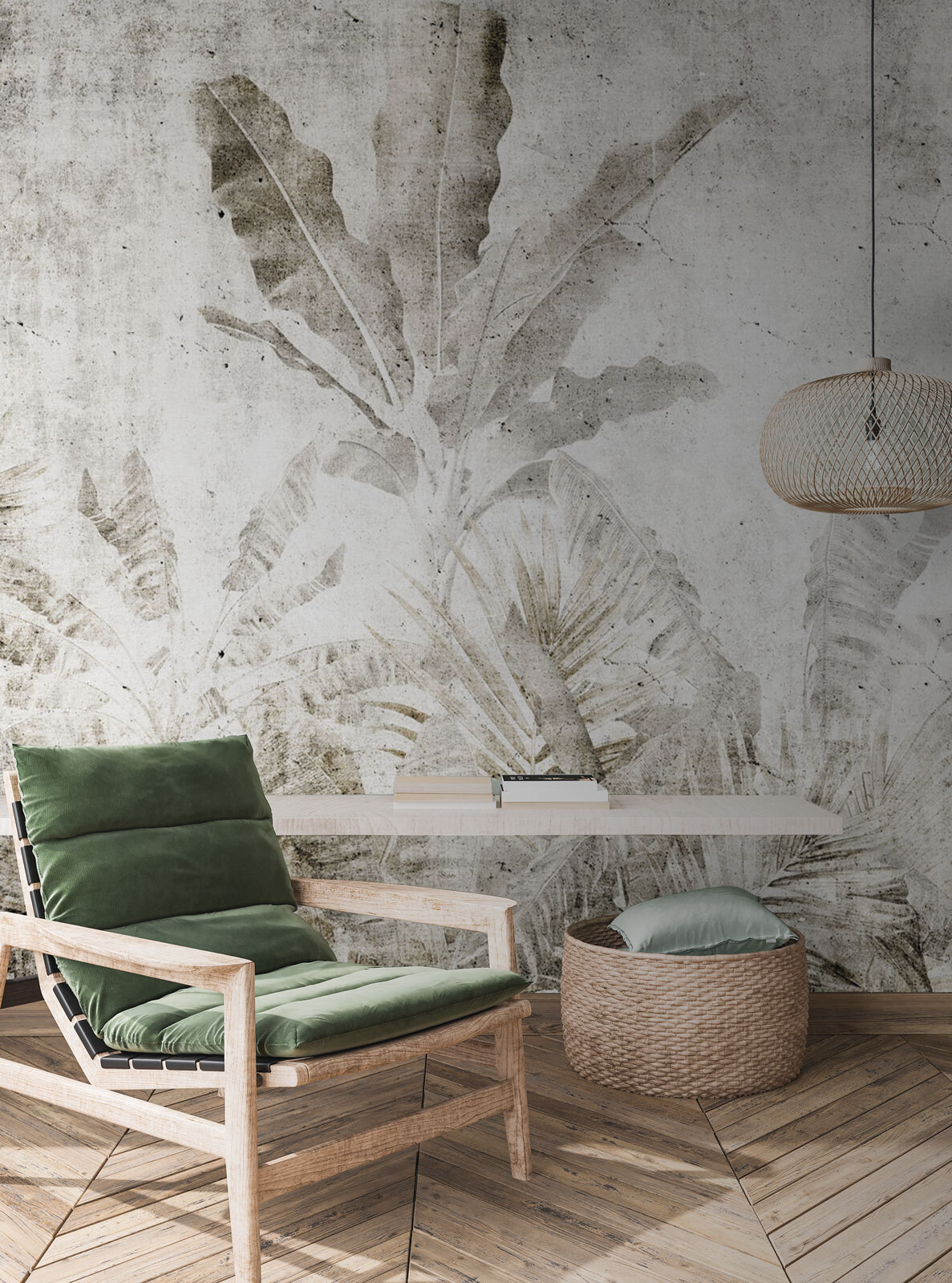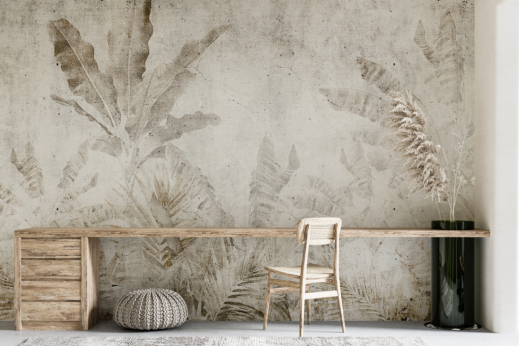 Imagine entrar en una habitación y sentirse transportado instantáneamente a un refugio rústico de ensueño. Eso es lo que hace este mural “Faded Leaves on Rustic Wall”. Tiene un encanto relajante y desgastado, como un viejo libro favorito. Las delicadas hojas descoloridas sobre un fondo de hormigón añaden una textura sutil y un poco de misterio. De algún modo, consigue ser moderno y terrenal al mismo tiempo, como un jardín secreto que se mezcla con las vibraciones industriales. Perfecto para cualquiera que desee que su espacio transmita calma y estilo sin esfuerzo.