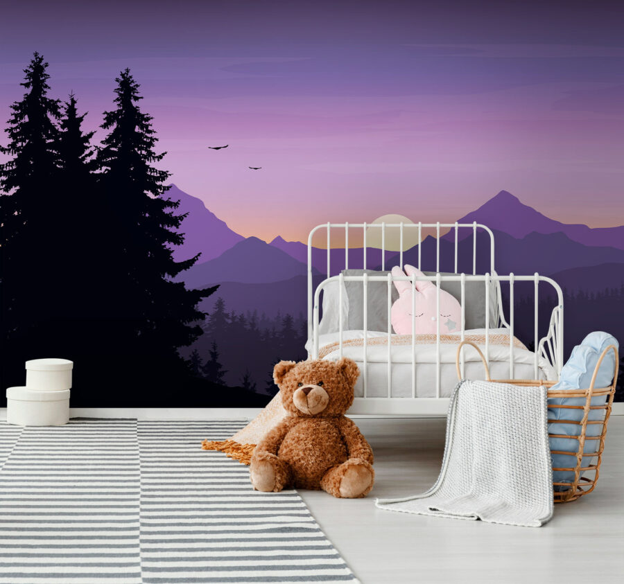 Imagina entrar en un acogedor refugio, rodeado de la serena belleza de la naturaleza, sin salir de casa. Este mural, con un impresionante paisaje de árboles y montañas, lleva ese sueño directamente a tus paredes. Suaves tonos morados bailan en el cielo mientras se pone el sol, proyectando un brillo encantador. Es como tu propio refugio de paz, donde el estrés se desvanece. Imagina acurrucarte con un buen libro o compartir historias con amigos, mientras disfrutas de esta tranquila vista. Cada mirada a esas majestuosas montañas y altos árboles puede inspirarte una pequeña aventura, o al menos soñar despierto con ella. Perfecto para los amantes de la naturaleza y aquellos que buscan añadir un toque de calma a su espacio. ¿Por qué no dejar que tus paredes hablen por ti? Después de todo, ¿quién no querría un poco de la naturaleza en su hogar?