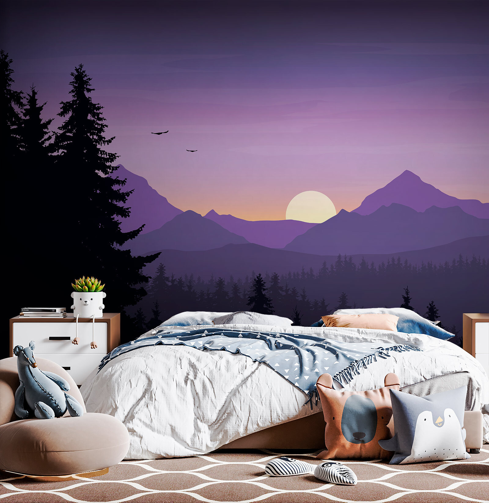 Imagina entrar en un acogedor refugio, rodeado de la serena belleza de la naturaleza, sin salir de casa. Este mural, con un impresionante paisaje de árboles y montañas, lleva ese sueño directamente a tus paredes. Suaves tonos morados bailan en el cielo mientras se pone el sol, proyectando un brillo encantador. Es como tu propio refugio de paz, donde el estrés se desvanece. Imagina acurrucarte con un buen libro o compartir historias con amigos, mientras disfrutas de esta tranquila vista. Cada mirada a esas majestuosas montañas y altos árboles puede inspirarte una pequeña aventura, o al menos soñar despierto con ella. Perfecto para los amantes de la naturaleza y aquellos que buscan añadir un toque de calma a su espacio. ¿Por qué no dejar que tus paredes hablen por ti? Después de todo, ¿quién no querría un poco de la naturaleza en su hogar?
