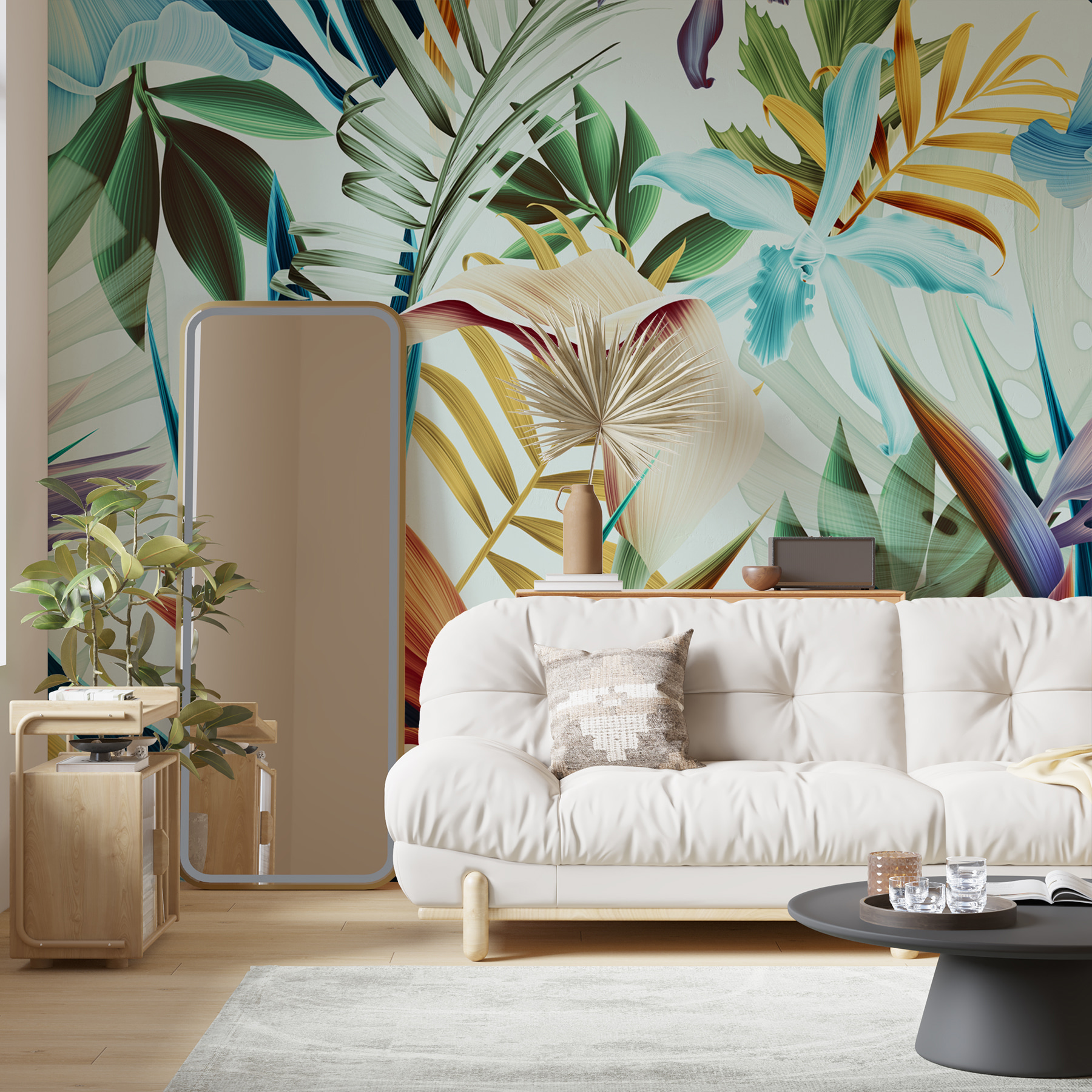 Imagina que te tomas el café de la mañana con un fondo de follaje vibrante, como si estuvieras en una selva tropical en el salón de tu casa. Cada hoja y cada flor parecen haber sido pintadas por un artista botánico amante de los colores llamativos. No es sólo papel pintado; es una experiencia, que inyecta vida y un toque salvaje a tu espacio.