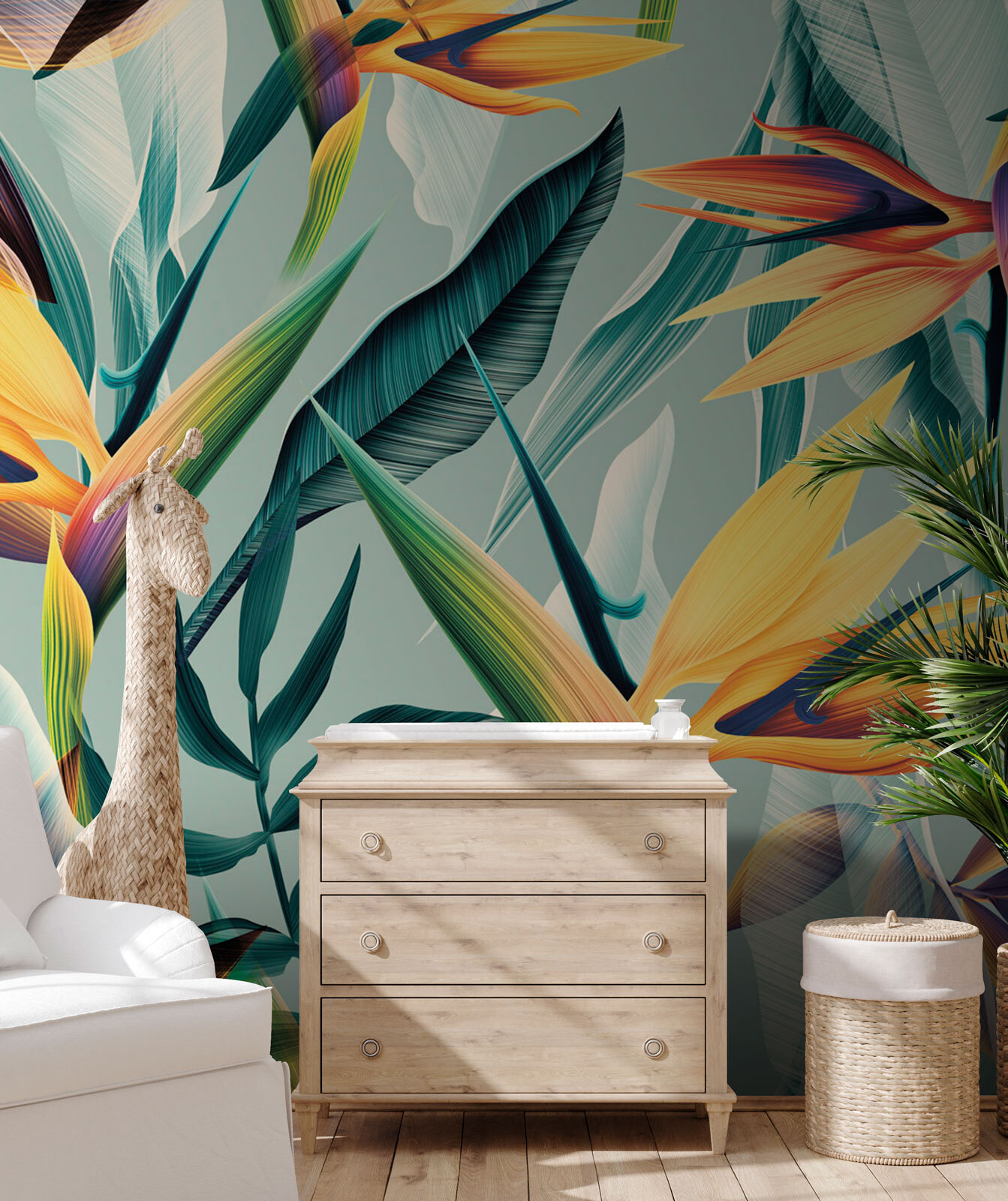 ¿Te gusta la decoración única? Echa un vistazo al mural “Aves del paraíso”. No es sólo una pieza, es una experiencia, como adentrarse en un vibrante paraíso selvático. Imagínese despertarse cada día con esos fascinantes colores y ese intrincado follaje. Forma parte de nuestra colección de papeles pintados de diseño, que combina el arte moderno con la belleza salvaje de la naturaleza.