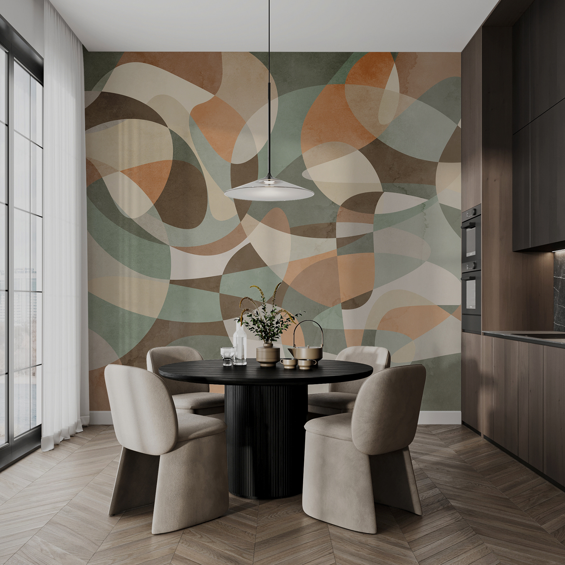 Transforme su espacio en un refugio acogedor con este mural de pared con formas abstractas en tonos pastel que se superponen juguetonamente. Piense en los tonos sutiles que se entrelazan como una brisa tranquila o una tarde perezosa. Es perfecto para aquellos que quieren un ambiente fresco sin llamar la atención. Imagínese tomando un café mientras contempla este mural, sintiéndose relajado e inspirado a la vez. Es el tipo de pieza que podría suscitar una conversación o incluso un debate desenfadado sobre a qué le recuerdan las formas, ¿quizá a una medusa bailando? Ideal para salones o espacios creativos, este mural aporta un toque de calidez y personalidad.