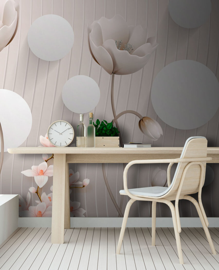 Transforme cualquier espacio con este impresionante mural de pared con delicadas flores y juguetones círculos. Imagínese entrar en una habitación donde las flores suaves invitan a la tranquilidad y el encanto. Es como una suave brisa después de un largo día, que te envuelve en calidez y tranquilidad. Perfecto para iluminar un rincón de lectura acogedor o animar un pasillo aburrido. Esos colores sutiles combinan a la perfección con casi cualquier estilo de decoración, haciendo que se sienta elegante sin esfuerzo. Los invitados pensarán que has contratado a un diseñador. Además, es un recordatorio de que la vida es demasiado corta para no añadir un poco de belleza.