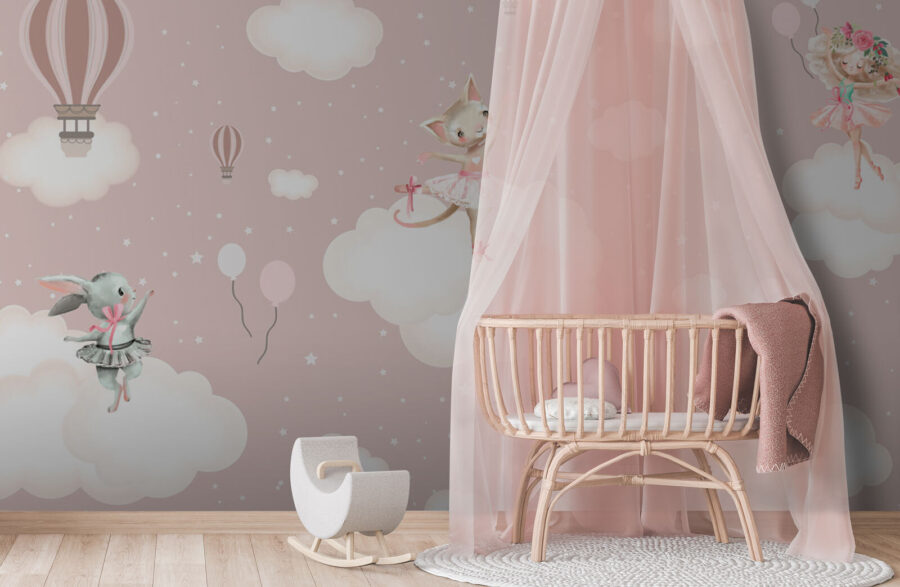 Imagínate la hora de dormir con este mural como telón de fondo; se desarrollarán cuentos de aventuras de ballet de nubes, con esos encantadores animales listos para saltar de la pared y entrar en los sueños. No es sólo decoración; es un mundo caprichoso que invita a tu hijo a imaginar y reír. ¿A que es divertido?