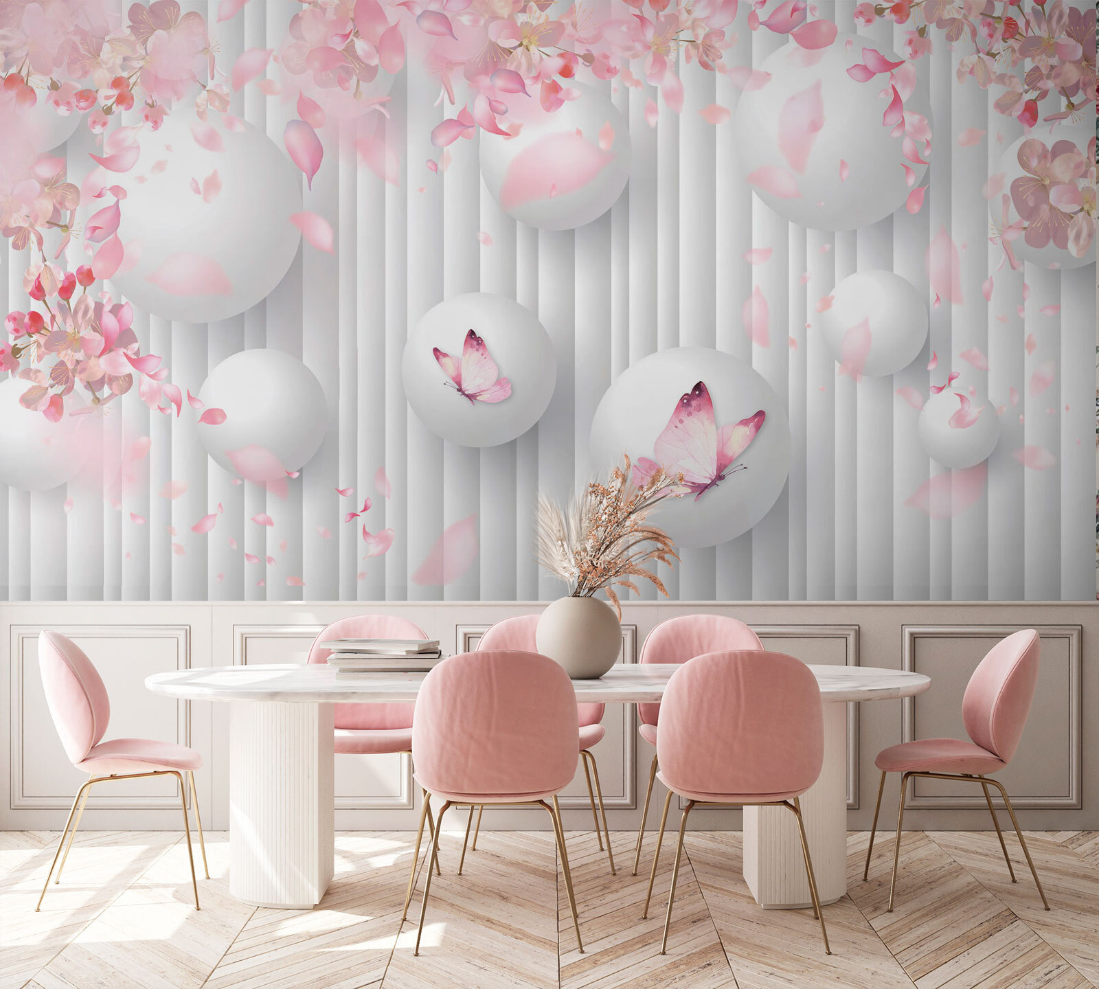 Transforma esa pared lisa en una obra de arte con este encantador mural, que presenta una caprichosa danza de esferas blancas adornadas con encantadoras mariposas rosas. Imagínate tomando tu café matutino en un espacio que parece un sereno jardín japonés, donde cada mirada a la pared te ofrece una pequeña explosión de alegría. Los suaves pétalos que revolotean alrededor evocan la agradable sensación de la primavera, aportando un ambiente cálido y alegre. Es como tener la naturaleza en casa, ¡pero sin la alergia al polen! Perfecto para cualquier habitación que necesite un toque de calma y creatividad. ¡Prepárate para recibir un montón de cumplidos! Este mural no es solo decoración, es un estimulante del estado de ánimo.