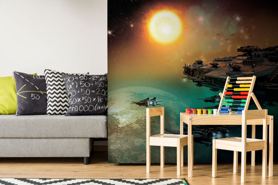 Perfecto para el estudio de cualquier amante del espacio o para la habitación de tus hijos, las detalladas naves estelares, el sol resplandeciente y los planetas lejanos hacen que la habitación parezca una escena sacada directamente de una superproducción de ciencia ficción. Tiene un aire mágico que te hará soñar despierto con galaxias muy, muy lejanas. Además, mola mucho más que mirar a una simple pared, ¿verdad? Casi puedes oír el zumbido de los motores y sentir la emoción de la exploración espacial. En serio, puede que te inspire para convertirte en astronauta… o al menos para volver a ver tus películas espaciales favoritas. Añade un poco de universo a tu vida diaria: ¡trae a casa las estrellas!