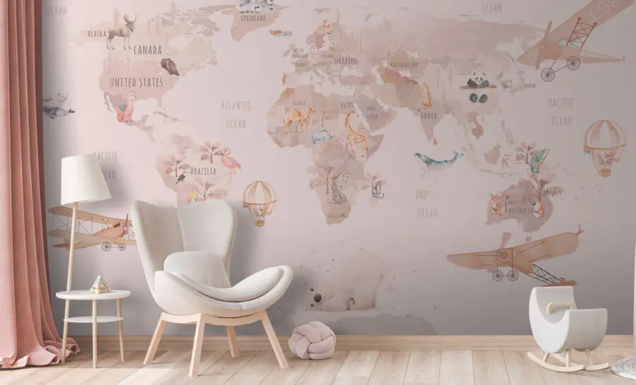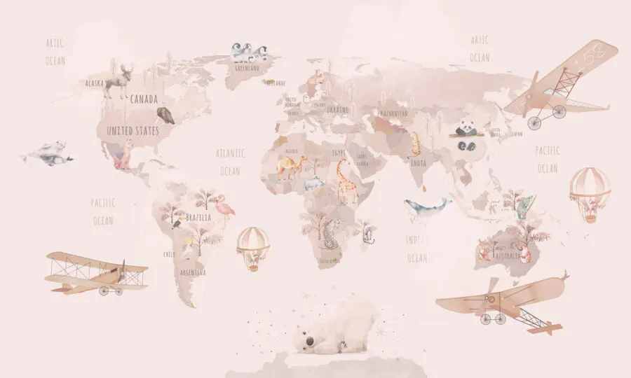 Despídete de las paredes aburridas con este encantador mural. “Mapa del mundo con animales” no es sólo un mapa, es una aventura a punto de comenzar. Perfecto para la habitación de tu pequeño explorador, este mural muestra de dónde son todos sus animales favoritos. Imagina a tu hija riéndose con los pingüinos del Polo Sur o soñando despierta con las jirafas africanas y las puestas de sol de la sabana. Además, añade un toque dulce y caprichoso a cualquier espacio. Educativo, divertido y absolutamente adorable: ¡prepárate para un montón de “oohs” y “aahs” de niños y mayores por igual!