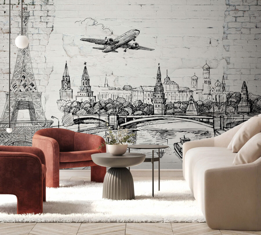 Transforma una pared lisa en un tema de conversación con este llamativo mural, que presenta un paisaje urbano en estilo boceto y un puente emblemático. Es como tomarse unas minivacaciones cada vez que entras en la habitación: ¿quién no querría disfrutar de unas vistas de la Torre Eiffel y el Kremlin? Imagínate tomando tu café matutino, soñando despierto con tus viajes o planeando tu próxima aventura. El diseño en blanco y negro le da un toque elegante, por lo que combina fácilmente con cualquier decoración. Además, seguro que despertará la curiosidad: ¡tus amigos pensarán que acabas de volver de un viaje relámpago! Un toque de cultura en tu pared, perfecto para aquellos corazones llenos de pasión por los viajes.