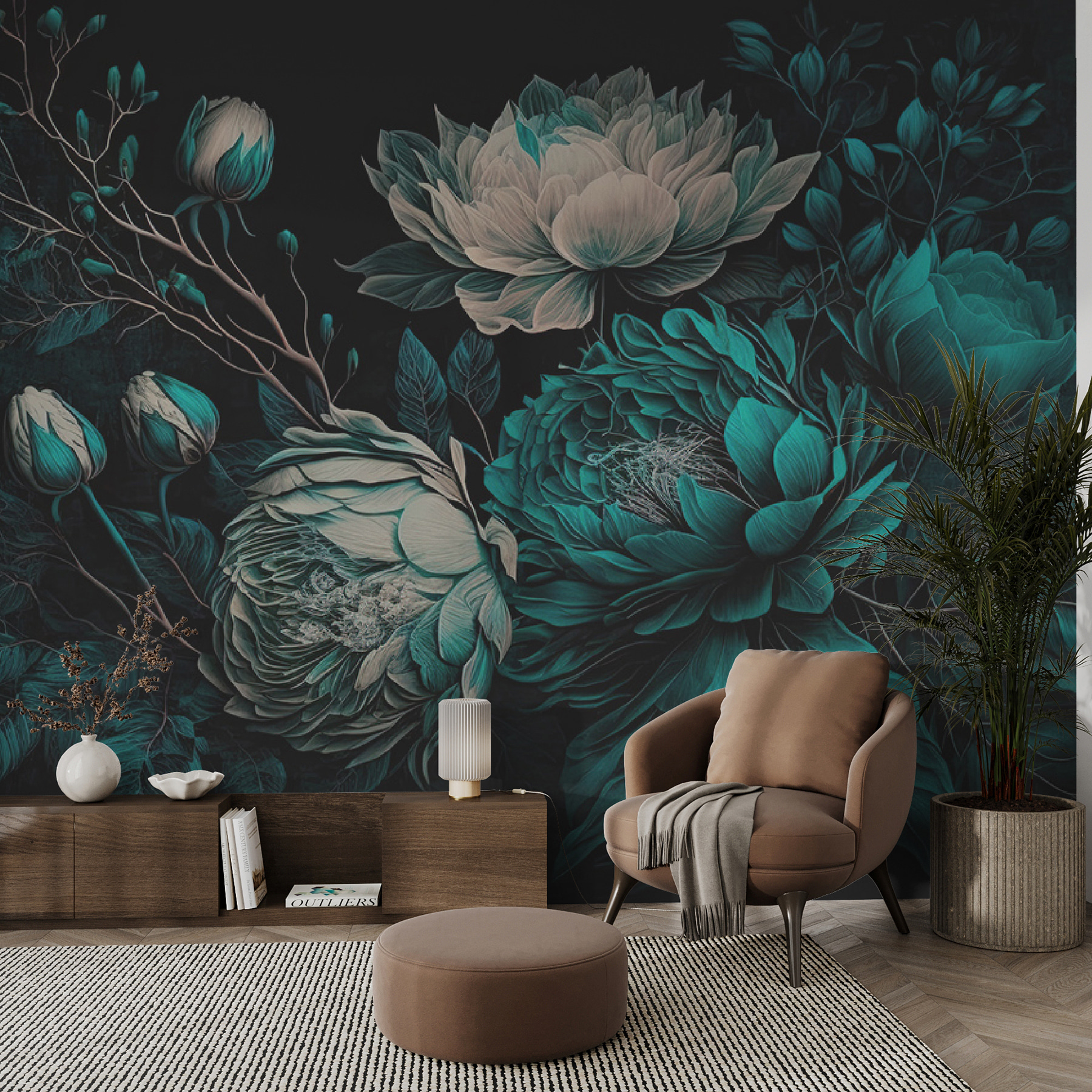Imagínese entrar en una habitación en la que las flores florecen en profundos tonos verde azulado. Este mural de pared, “Vibrant Flowers Blossom”, es como celebrar una fiesta en un jardín interior, sin el zumbido de las abejas. Tiene esa magia tridimensional: parece que estas flores vayan a florecer en cualquier momento. Los colores verde azulado son tranquilizadores y ricos a la vez. Perfecto para un salón o un dormitorio que necesite un toque de dramatismo.