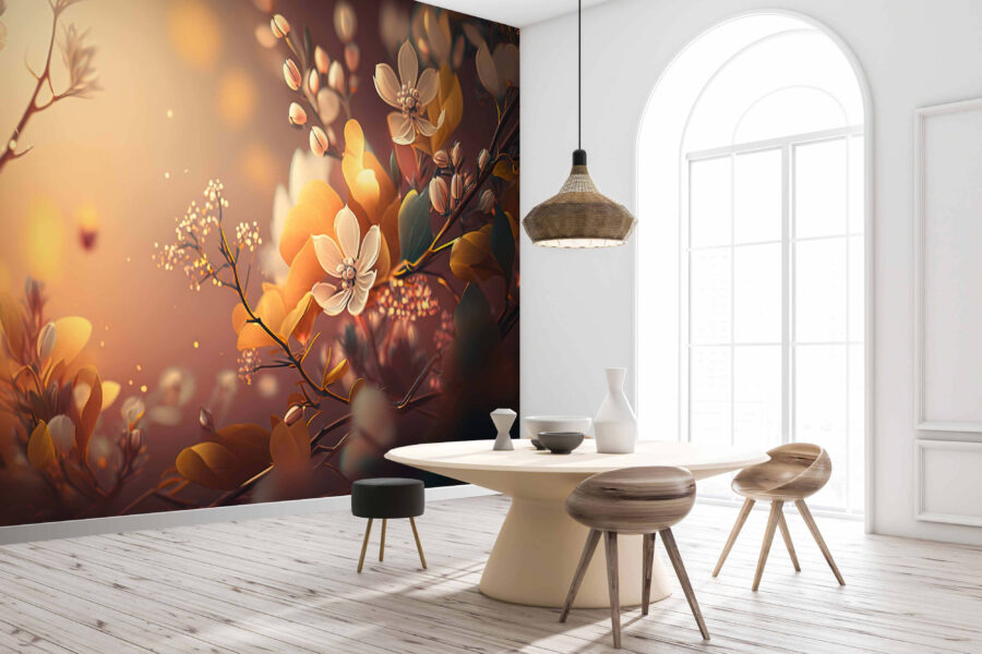 Imagine entrar en una habitación donde las paredes florecen con delicadas flores de colores cálidos. Este mural de pared “Delicate Blossoms” transforma cualquier espacio en un brillante refugio floral. Perfecto para esos días grises de invierno en los que un toque de primavera se siente como el cálido abrazo de un amigo. Los tonos suaves de amarillos, naranjas y verdes sutiles bailan por el mural, añadiendo profundidad y una suave sensación de movimiento. Es como tener un jardín que nunca se marchita en el salón de casa. Imagínate un rincón de lectura acogedor o incluso un dormitorio: cada mirada a estas flores es un dulce recordatorio de la belleza de la naturaleza. Además, tiene algo muy acogedor y relajante. Este mural no sólo decora una pared, sino que aporta una sensación de serenidad y suave alegría a su hogar. ¡Una dosis diaria de deleite floral sin la regadera! 🌸