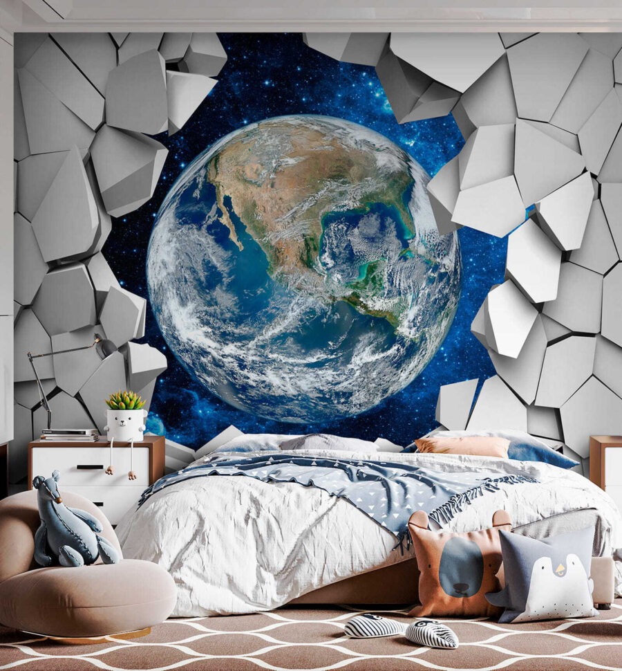 Oye, mira este genial mural: “Hexágono blanco con bordes negros”. Es como adentrarse en un mundo futurista: superguay, ¿verdad? Imagínatelo en la habitación de un niño: cada mañana se sentiría como un explorador que atraviesa un portal hacia otra dimensión. Los hexágonos crean un efecto 3D que realza la habitación.