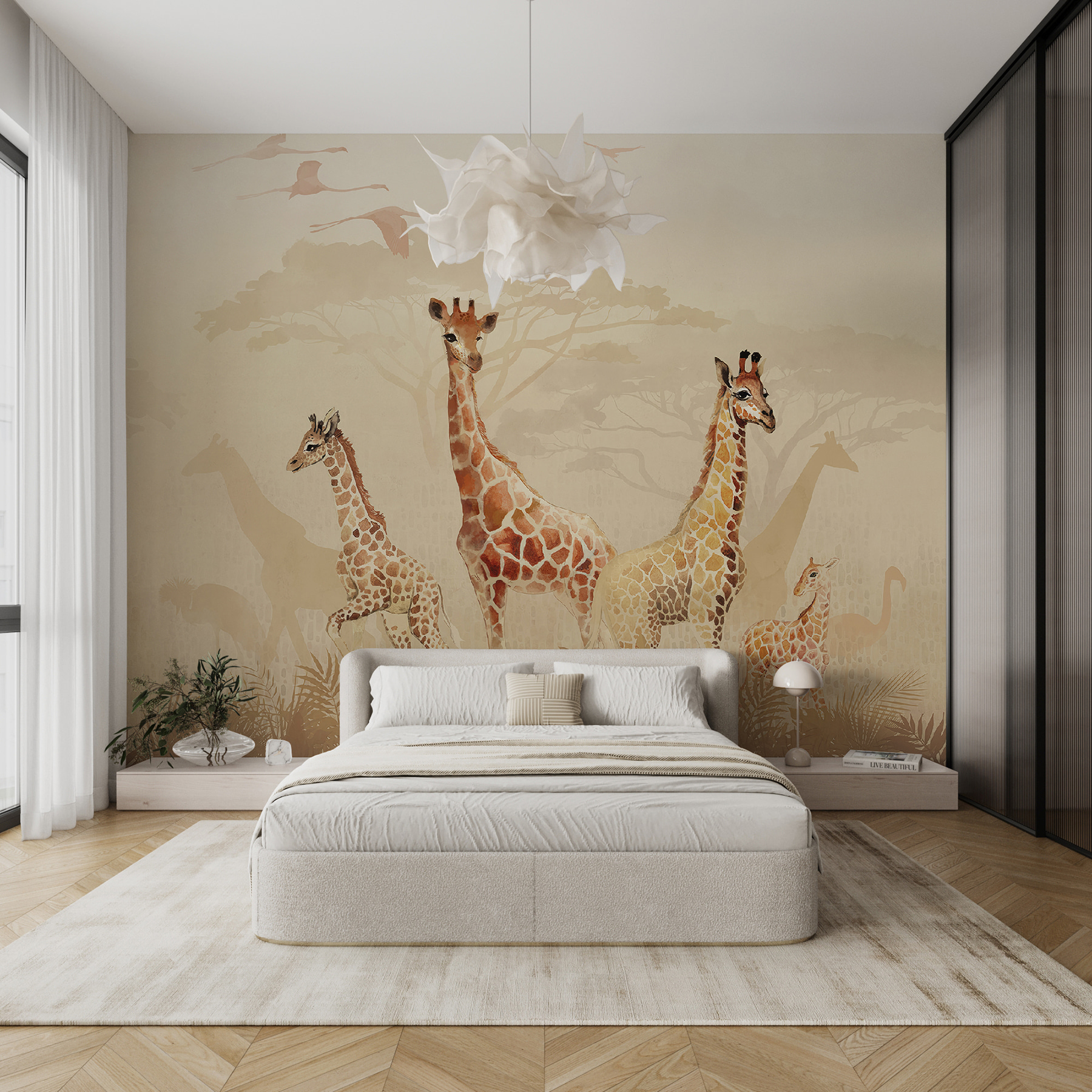 Hay algo caprichosamente tranquilizador en las jirafas; son los gentiles gigantes del mundo animal. Este mural captura de forma creativa su gracia y serenidad, haciendo que cualquier habitación parezca más amplia y relajada. Perfecto para la habitación de un niño o incluso para dar un toque extravagante a su oficina. Además, los colores suaves son agradables a la vista y combinan a la perfección con casi cualquier estilo de decoración.