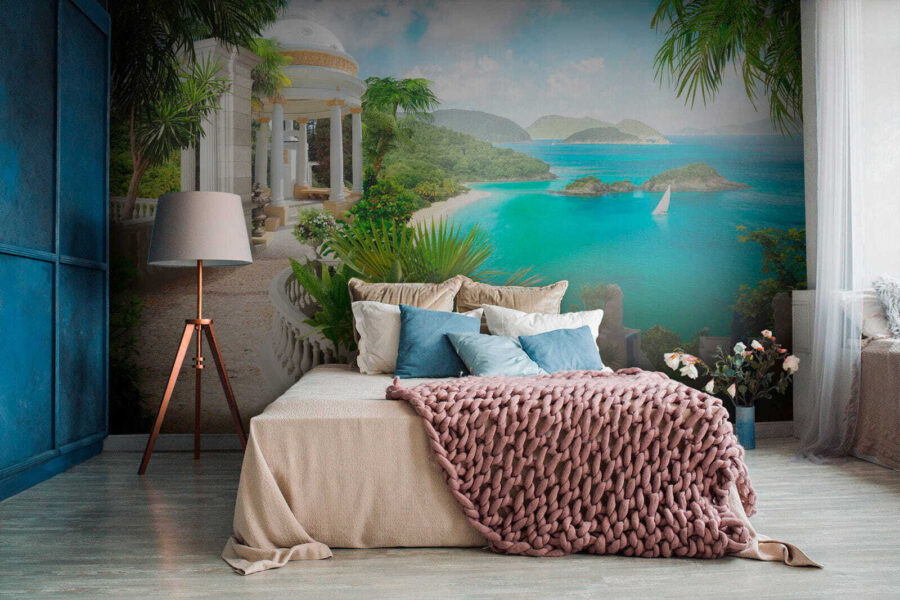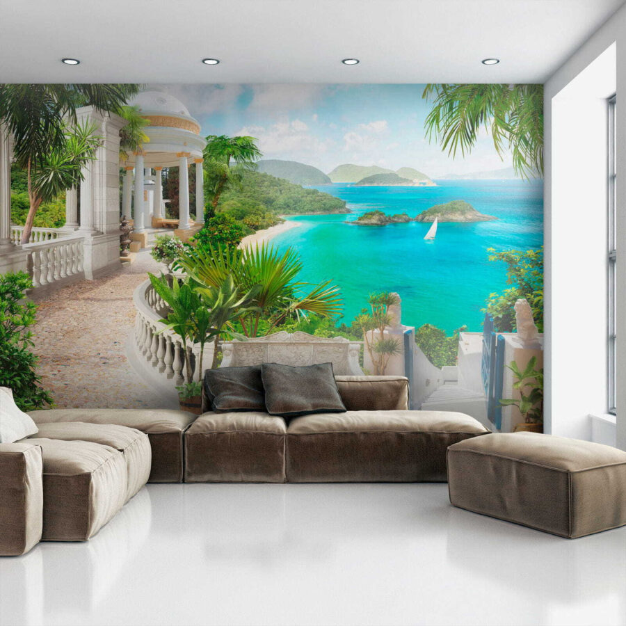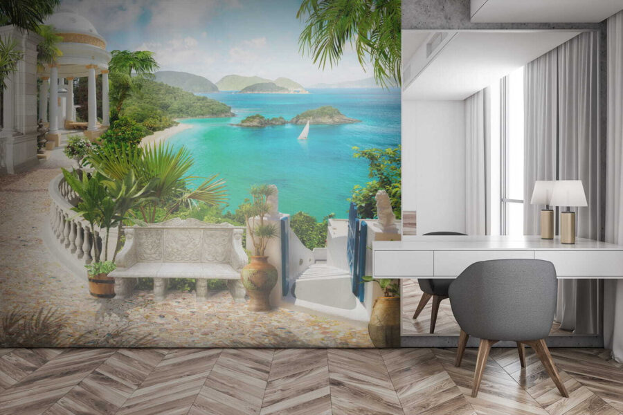 Imagínese esto: entrar en su habitación y transportarse instantáneamente a un sereno paraíso costero. Eso es exactamente lo que hace el mural “Planta en maceta”. Es como tener un pequeño lugar de vacaciones en la pared. Esas exuberantes plantas verdes, el apacible pabellón blanco y esa impresionante agua turquesa… ¡es la serenidad perfecta!