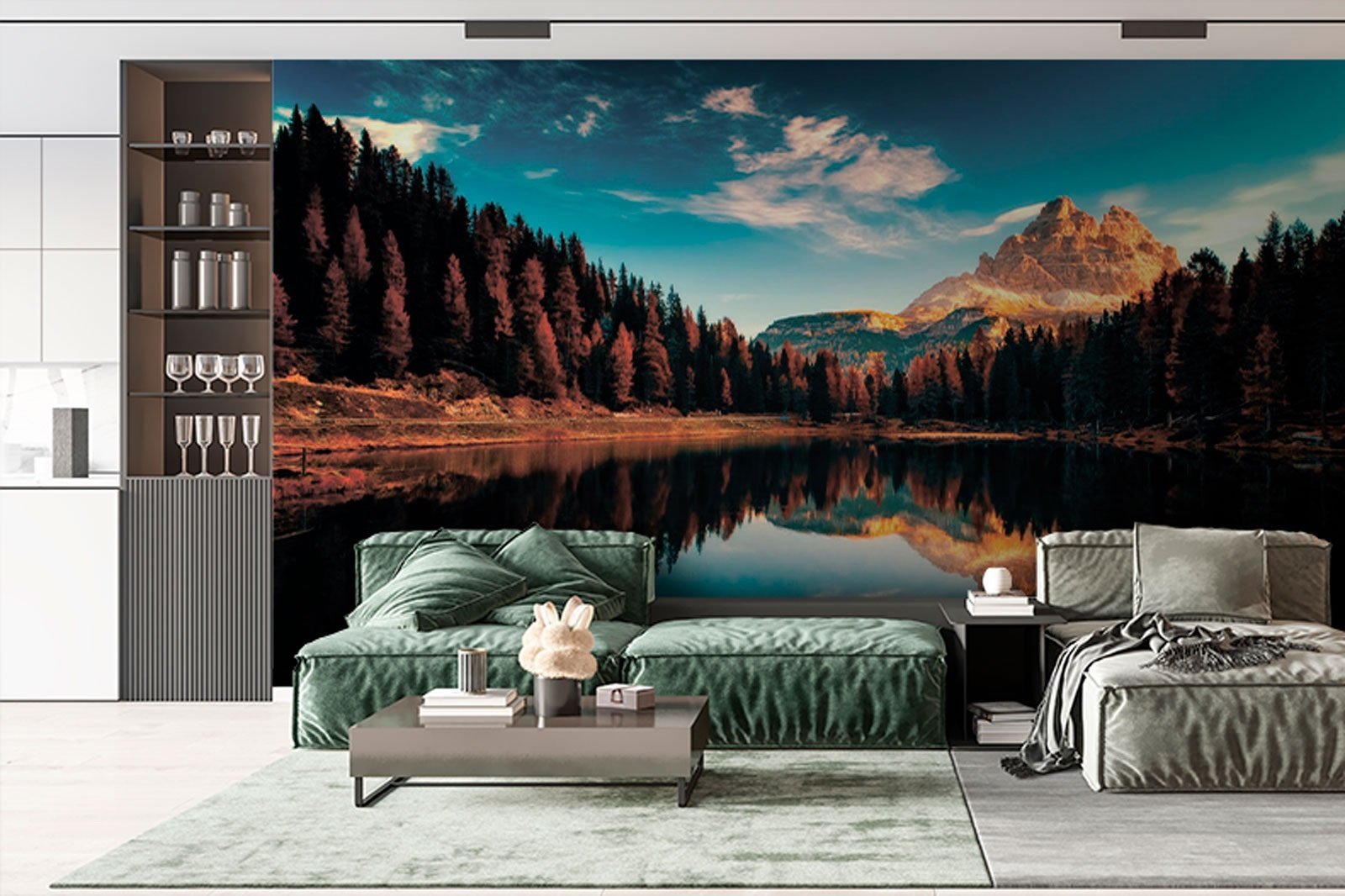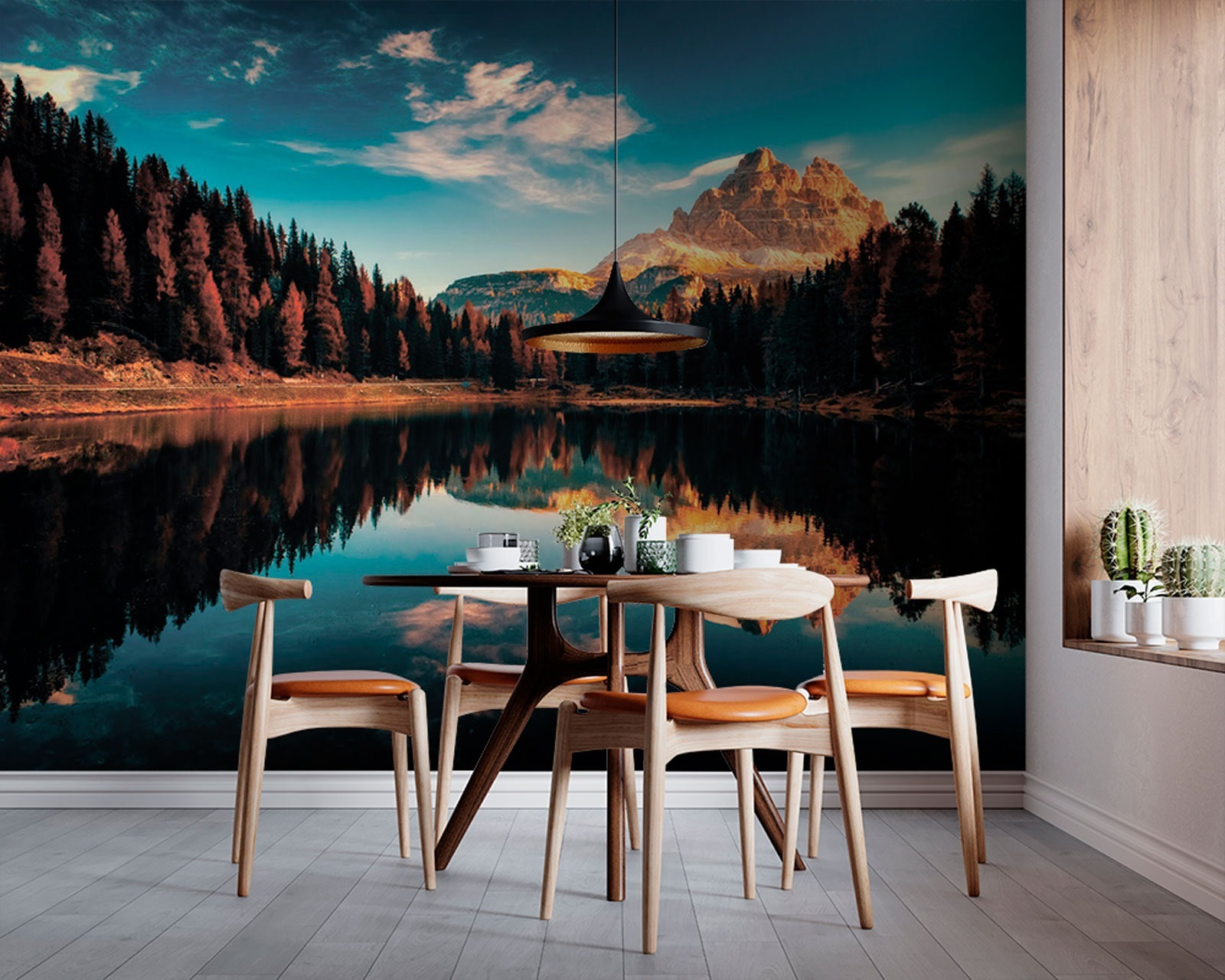 Imagina entrar en un espacio acogedor y, de repente, te llama la atención este impresionante mural de un tranquilo lago rodeado de majestuosos árboles y montañas. ¡Es como unas minivacaciones en tu pared! Los colores son tan vivos que prácticamente te invitan a sumergir los pies en el agua. Imagínate recibir a tus amigos y sentir cómo les invade una sensación de calma mientras charlan y beben, contemplando esta obra maestra. No es solo arte mural, es un creador de ambiente, una pieza destacada que convierte cualquier habitación en un refugio natural. ¿No oyes el suave chapoteo del agua y el susurro de los árboles? Este mural lleva un pedazo del aire libre al interior, perfecto para soñar despierto o planear tu próxima aventura. ¿Quién no querría eso?