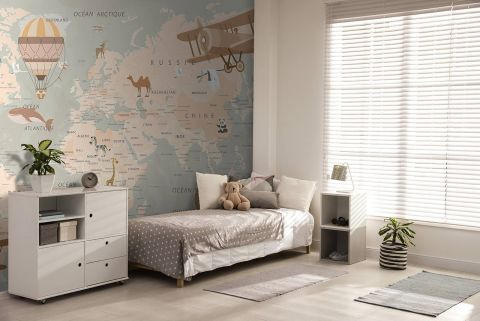 Imagina despertarte cada día con la visión de globos aerostáticos flotando sobre un mapamundi… ¡qué sueño! Este mural, titulado “Globo aerostático en el cielo”, combina sin esfuerzo la pasión por viajar con el caprichoso encanto de flotar por el mundo. Está en categorías como “Murales infantiles” y “Murales con mapas de la Tierra”, así que sabes que es perfecto tanto si estás decorando la habitación de un niño como si estás locamente enamorado de una decoración única. Imagina todas las historias que podría inspirar: viajes imaginarios a través de desiertos, selvas y océanos. Es como un billete a la aventura directamente en tu salón o espacio de juegos. Además, los serenos colores pastel prácticamente garantizan que te sentirás un poco más ligero, un poco más despreocupado, cada vez que lo mires.
