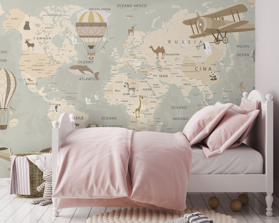 Imagine adentrarse en un mundo de aventuras cada vez que entre en una habitación. Este mural de globos aerostáticos elevándose sobre un mapa bellamente ilustrado invita a soñar despierto con tierras lejanas y viajes mágicos. Con colores vibrantes y detalles encantadores, es como tener unas minivacaciones en la pared. Imagínese a sus hijos o amigos reunidos alrededor, señalando los lugares que quieren visitar o recordando los viajes realizados. No es sólo una decoración, ¡es un tema de conversación! Perfecto para una habitación de juegos, un despacho o un acogedor rincón de lectura, este mural aporta alegría y curiosidad, haciendo que cualquier espacio parezca un poco más caprichoso. ¿A quién no le gustaría volar en globo, al menos en su imaginación?