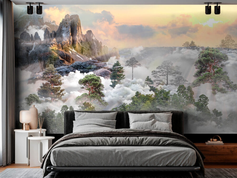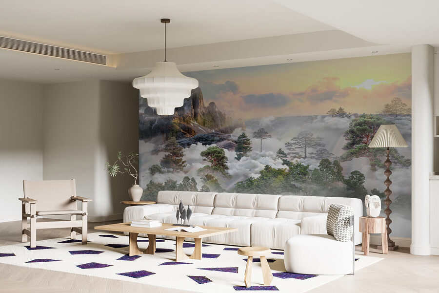 Imagínese una escapada de ensueño en su propia casa. El mural “Nubes en el cielo” es como una suave brisa que susurra historias de serenidad. Con suaves nubes a la deriva sobre majestuosas montañas, este mural le transporta a un lugar donde las preocupaciones se alejan flotando. Es perfecto para cualquier habitación que necesite un poco de fantasía, como salones o rincones acogedores.