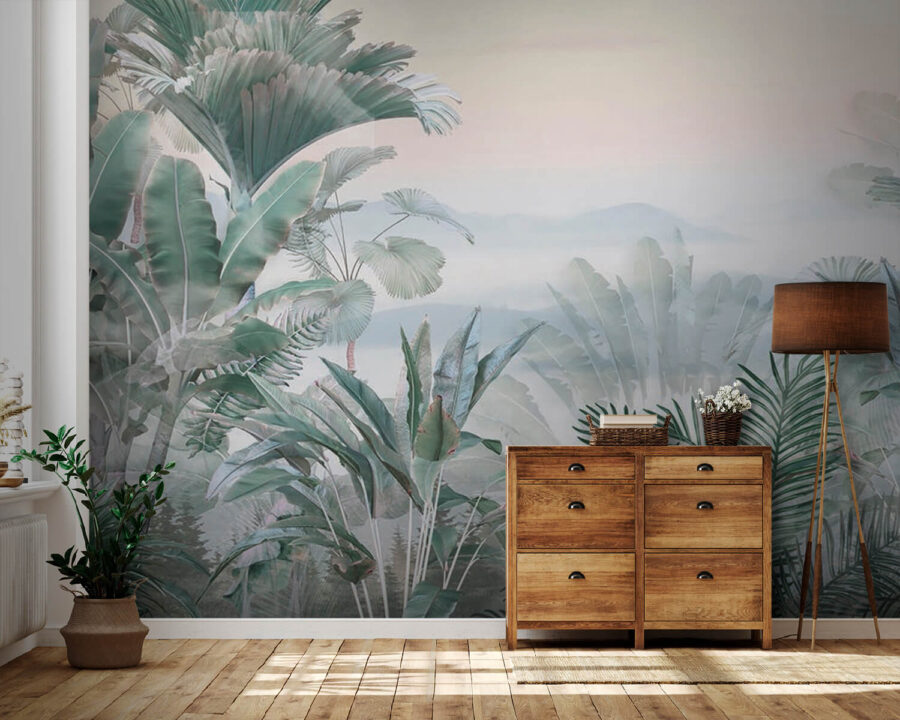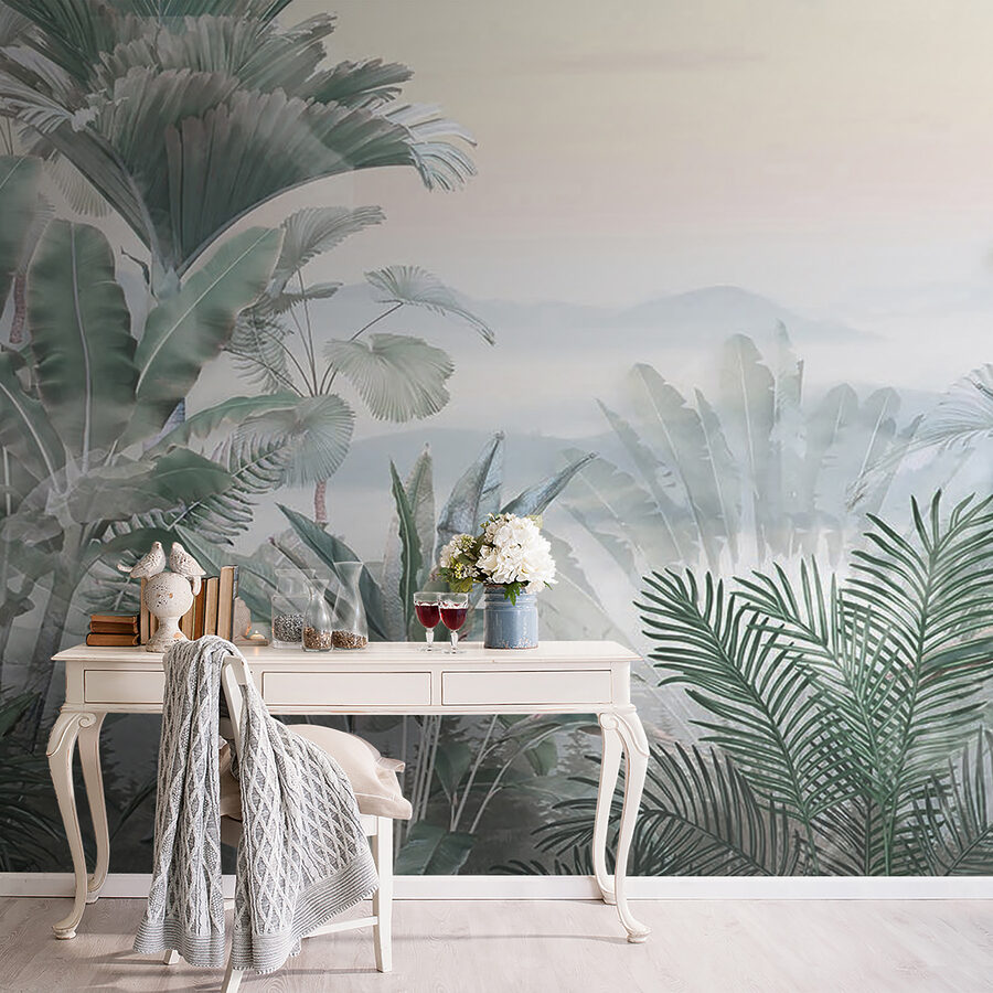 Una de las cosas más divertidas es cómo las hojas de palmera se funden en esta niebla de ensueño. Tiene el equilibrio perfecto entre ser llamativo y relajante. Y si tienes un pulgar verde o simplemente te gustan las plantas pero no puedes mantenerlas vivas, ¡no te preocupes! Este mural desprende esa exuberante sensación tropical sin una sola gota de agua. Ideal para perderse en sus pensamientos, aportando un poco de zen al ajetreo y el bullicio de la vida cotidiana.