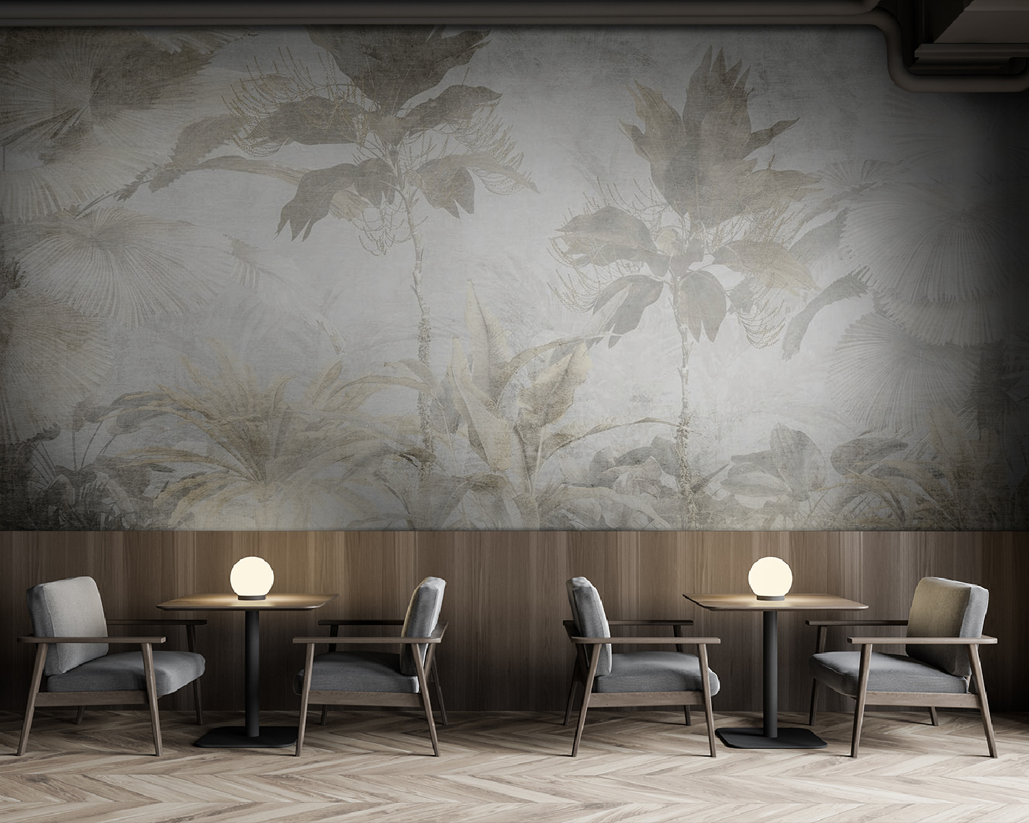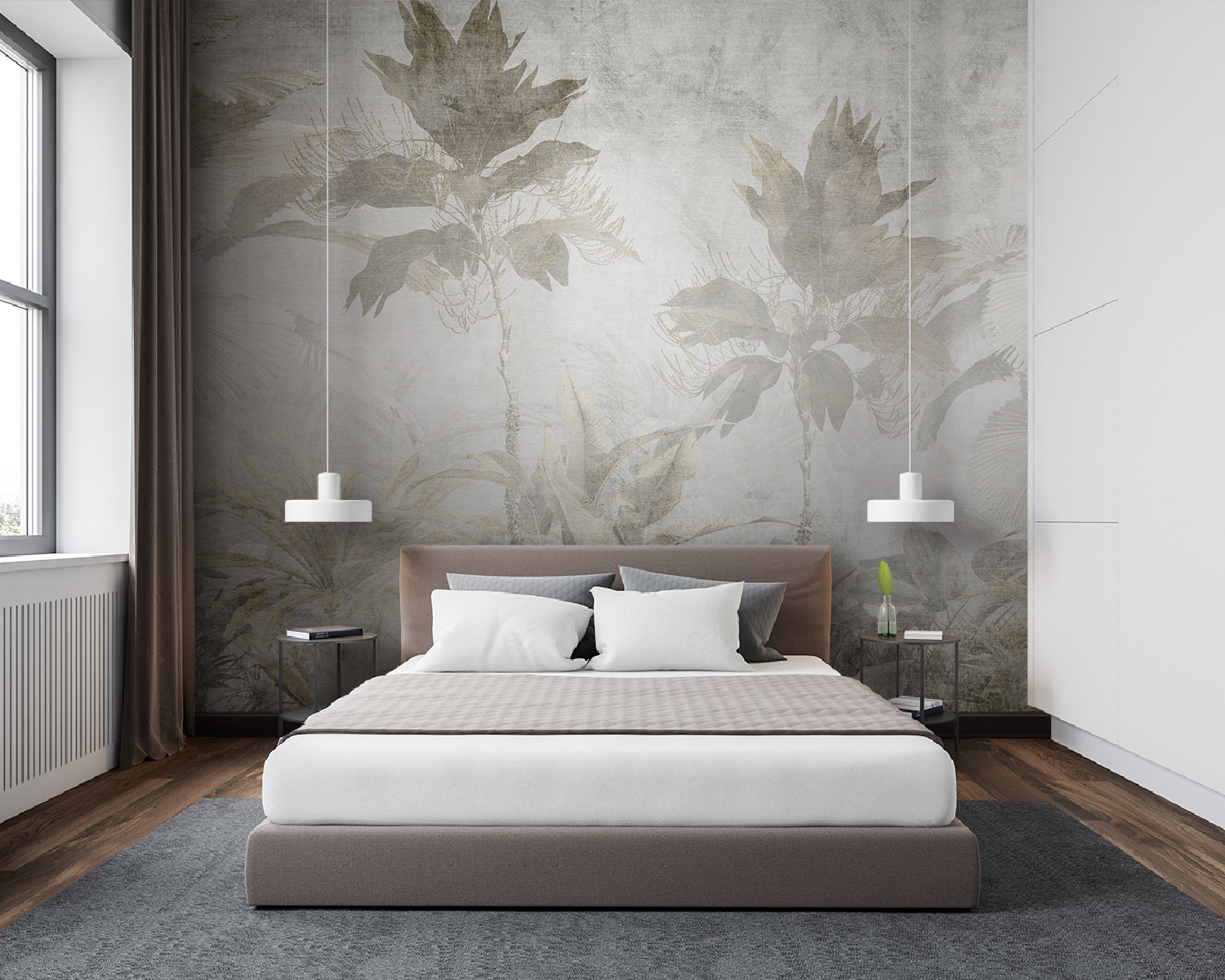 Este mural se adapta sin esfuerzo a cualquier habitación, ya sea un acogedor salón, un sereno dormitorio o incluso un elegante café. Los tonos apagados crean un ambiente de paz, como un suave susurro en la brisa matutina. ¿Y esas hojas de palmera? Añaden un toque exótico que te hace sentir como si te hubieras transportado a un paraíso tropical.