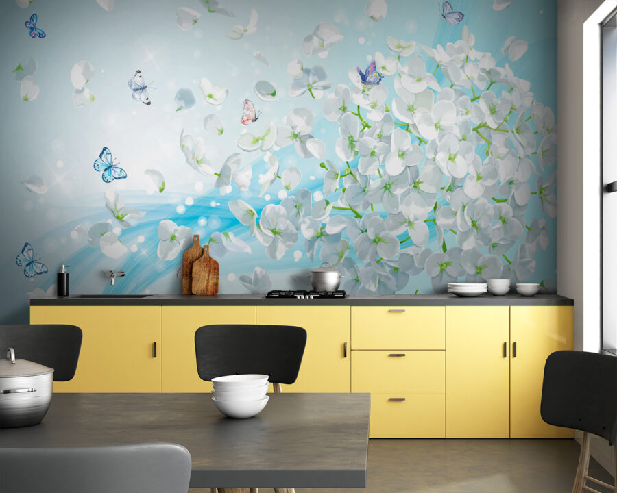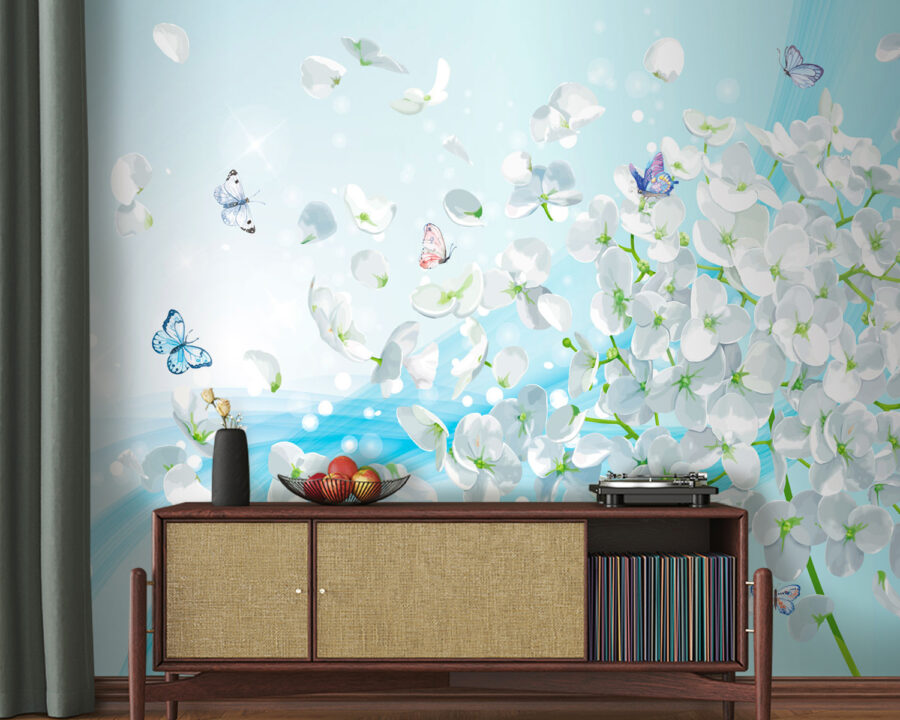 Transforma cualquier estancia con el encantador «Mural de flores blancas con mariposas volando». Imagínate entrando en un jardín tranquilo, donde delicadas flores bailan y mariposas revolotean por el aire: un pequeño pedazo de naturaleza en tu propia casa. Los colores suaves aportan una atmósfera relajante, perfecta para un rincón de lectura acogedor o una sala de estar animada. ¡Es como el aire fresco de la primavera! Pero no te preocupes por regar estas flores, ¡son de bajo mantenimiento! Tanto si recibes a tus amigos como si disfrutas de un momento de tranquilidad, este mural añade un toque de elegancia y fantasía. Imagínatelo: mariposas susurrando palabras bonitas y tú tomando café, sintiéndote como en un sueño. Es más que decoración, ¡es una experiencia!