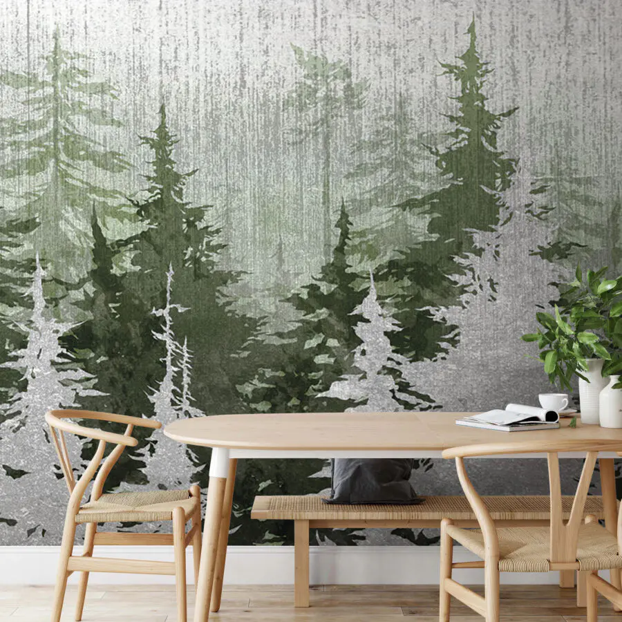 Transforme su espacio con este encantador mural de un bosque, donde los árboles parecen susurrar secretos a la brisa. Es como adentrarse en un bosque sereno sin salir del salón. Imagínese acogedoras tardes tomando el té mientras contempla los tranquilos verdes y los suaves grises. Las capas de árboles crean profundidad, casi como una escapada de ensueño de la vida cotidiana. Es perfecto para cualquiera que desee invitar a la belleza de la naturaleza a su hogar. Este mural no sólo decora una pared, sino que da vida a cualquier habitación. Puede que incluso se pregunte si pasará una ardilla.