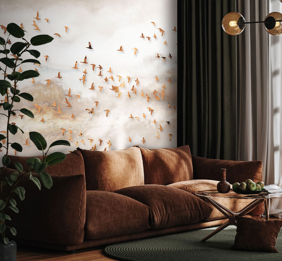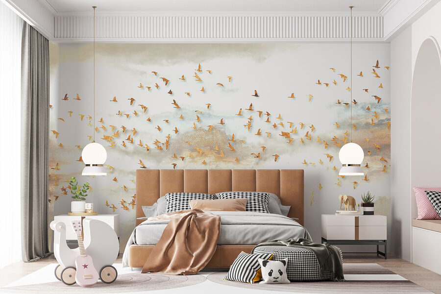 Transforme cualquier habitación en una escapada serena con este impresionante mural de pared de un grupo de pájaros volando por un cielo de ensueño. Los colores suaves y los graciosos pájaros crean una atmósfera que se siente tranquila y edificante, como una brisa fresca en un día de primavera. Imagínese tomando un café por la mañana o relajándose después de un largo día mientras contempla esta cautivadora escena. Te atrae, te hace soñar despierto y te cuenta historias. Además, añade un toque chic a cualquier espacio, ya sea un acogedor salón o un tranquilo dormitorio. ¿A quién no le gustaría sentirse como si estuviera volando por las nubes?