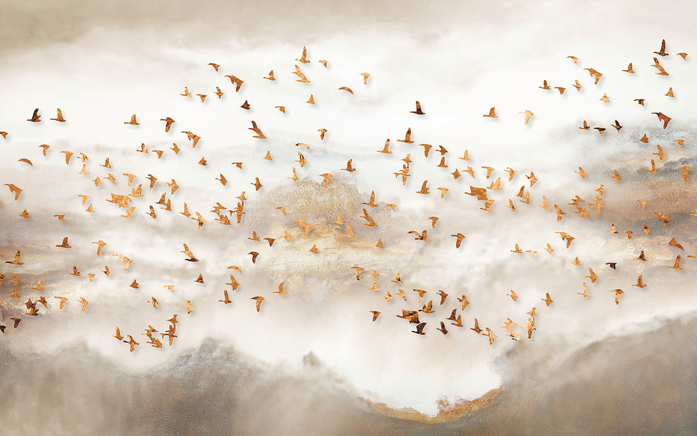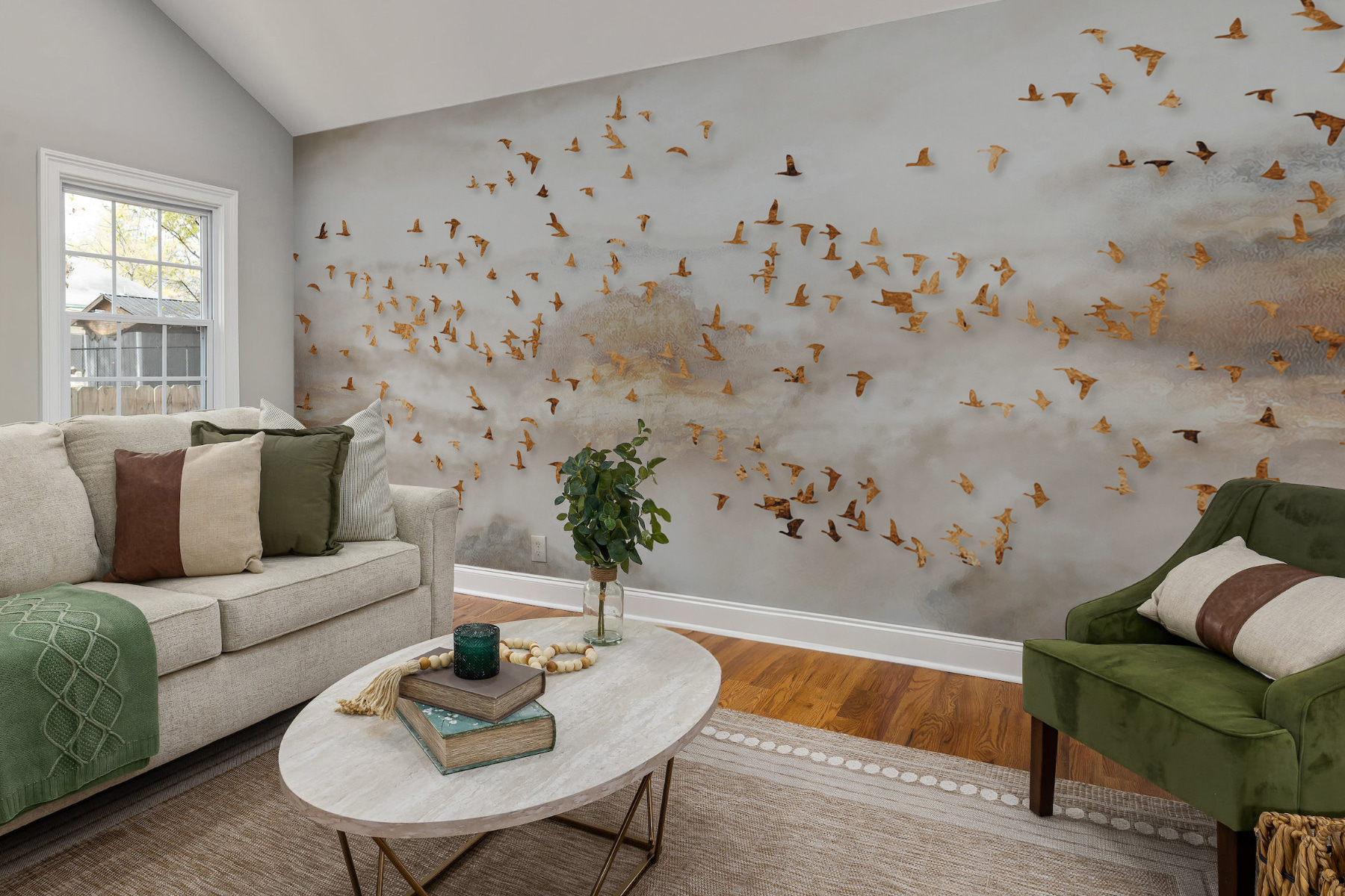 Transforme cualquier habitación en una escapada serena con este impresionante mural de pared de un grupo de pájaros volando por un cielo de ensueño. Los colores suaves y los graciosos pájaros crean una atmósfera que se siente tranquila y edificante, como una brisa fresca en un día de primavera. Imagínese tomando un café por la mañana o relajándose después de un largo día mientras contempla esta cautivadora escena. Te atrae, te hace soñar despierto y te cuenta historias. Además, añade un toque chic a cualquier espacio, ya sea un acogedor salón o un tranquilo dormitorio. ¿A quién no le gustaría sentirse como si estuviera volando por las nubes?