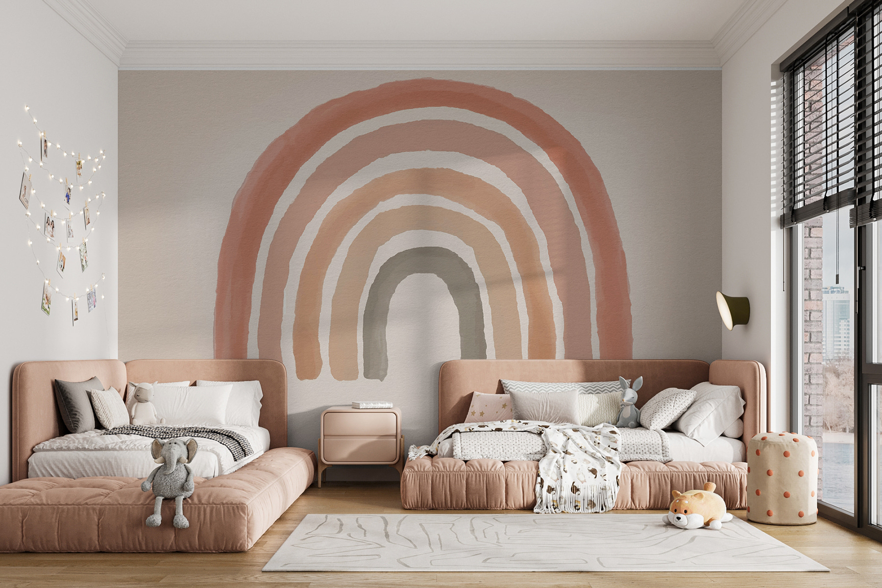 Además, es muy versátil, ¿no crees? Desprende vibraciones de ensueño sin ser demasiado ruidosa, lo que la convierte en un gran telón de fondo para la hora del cuento o el juego creativo. Y, seamos sinceros, ¿a quién no le gustaría contemplar un alegre arco iris todos los días? Este mural pretende aportar encanto y alegría a tu hogar, pincelada a pincelada.