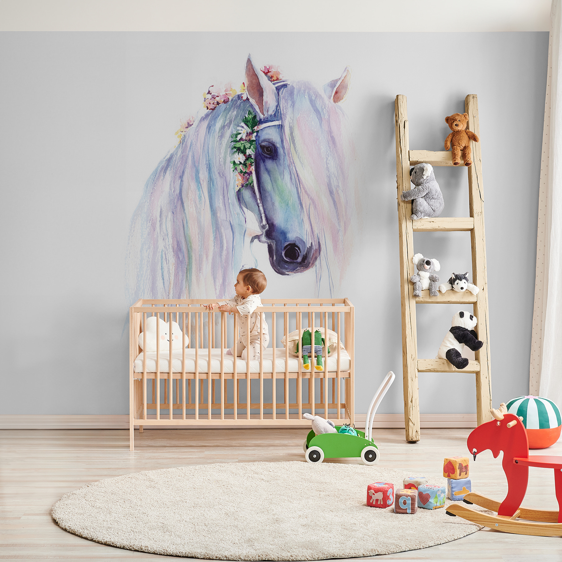 Ilumine cualquier espacio con este encantador mural de pared con un majestuoso caballo adornado con flores. Imagina entrar en una habitación y ser recibido por este apacible gigante, con su elegante crin cayendo en cascada como una cascada de color. Perfecto tanto para los niños como para los amantes de la decoración caprichosa, aporta un toque de naturaleza al interior de la casa. Los suaves tonos pastel hacen que todo parezca más ligero y que sea difícil no sonreír. Imagínese leyendo un cuento con los más pequeños acurrucados cerca de este mural: cada mirada es una pequeña aventura a punto de suceder. No es sólo una decoración, ¡es una invitación a soñar!