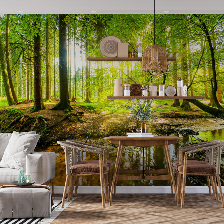 Imagínese entrar en su pequeño refugio forestal cada vez que entre en la habitación. Este mural de pared trae una vibrante escena de bosque directamente a su espacio, con altos árboles y la luz del sol filtrándose a través de las hojas. Es como si la propia naturaleza hubiera decidido instalarse aquí. Imagínese acurrucándose con un buen libro, rodeado de tonos verdes y las suaves y terrosas vibraciones del suelo de un bosque. Y si alguna vez necesitas un momento para escapar de la rutina diaria, este mural te ayudará. Perfecto para soñar despierto con excursiones y aventuras al aire libre, o simplemente para disfrutar de una acogedora tarde en casa. Es un toque de tranquilidad que causa un gran impacto, convirtiendo cualquier pared en un soplo de aire fresco. ¿Quién podría resistirse?