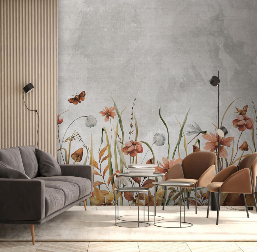 Transforma tu espacio en un jardín de ensueño con este impresionante mural de flores y hierba. Imagínate despertarte cada día rodeado de delicadas flores y suaves tonos verdes, como si estuvieras en plena naturaleza, ¡pero sin insectos! Los colores suaves evocan una sensación de calma, lo que lo hace perfecto para una acogedora sala de estar o un tranquilo dormitorio.
