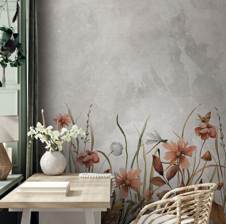 Transforma tu espacio en un jardín de ensueño con este impresionante mural de flores y hierba. Imagínate despertarte cada día rodeado de delicadas flores y suaves tonos verdes, como si estuvieras en plena naturaleza, ¡pero sin insectos! Los colores suaves evocan una sensación de calma, lo que lo hace perfecto para una acogedora sala de estar o un tranquilo dormitorio.