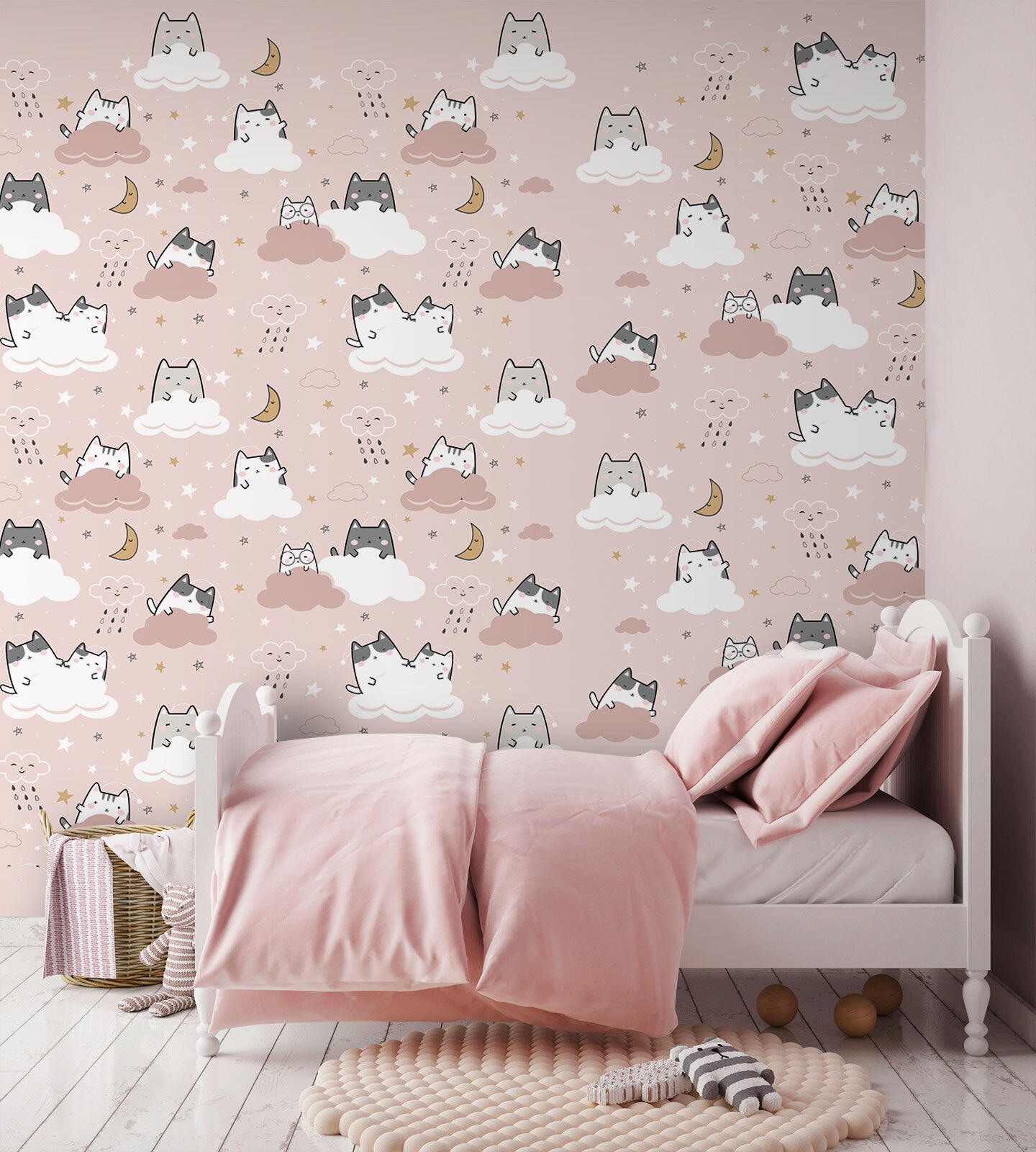 Las suaves nubes de colores pastel están abrazadas por estrellas dormilonas y lunas diminutas, lo que hace que parezca una escena sacada directamente de un cuento para dormir. Cada gatito tiene un aspecto tan acogedor que desearás unirte a ellos. Es algo más que decoración: es un toque de magia que convierte cualquier espacio en un paraíso de confort y deleite.