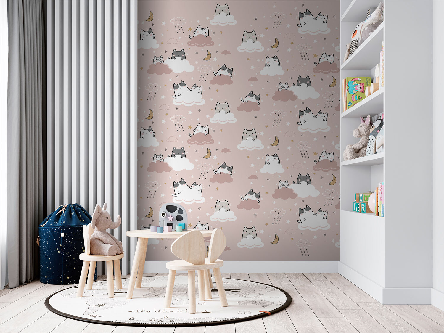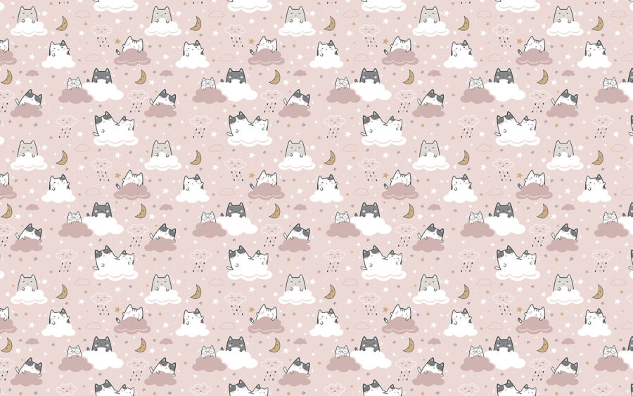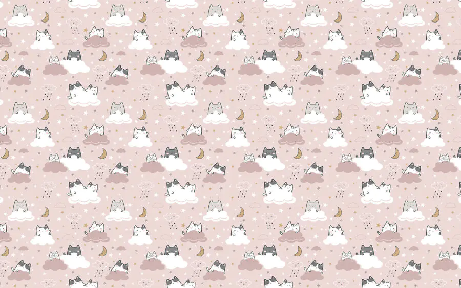 Imagínese que entra en una habitación cuyas paredes son un caprichoso sueño despierto. Saluda al mural “Patrón de gatos sobre nubes”. Es como si el universo hubiera decidido rociar un poco de hilaridad con gatos descansando sobre mullidas almohadas de aire allá donde mires. Perfecto para la habitación de tu pequeño o, incluso, para la tuya propia, ¡no te juzgamos!